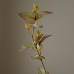 This White Eucalyptus Leaf features two slender stems with muted white-green leaves, each displaying a soft, smooth texture with hints of earthy tones. The leaves are arranged in an alternating pattern, accompanied by small, round buds near the tips, giving the stems a natural and airy structure. The stems measure 64 cm in height.