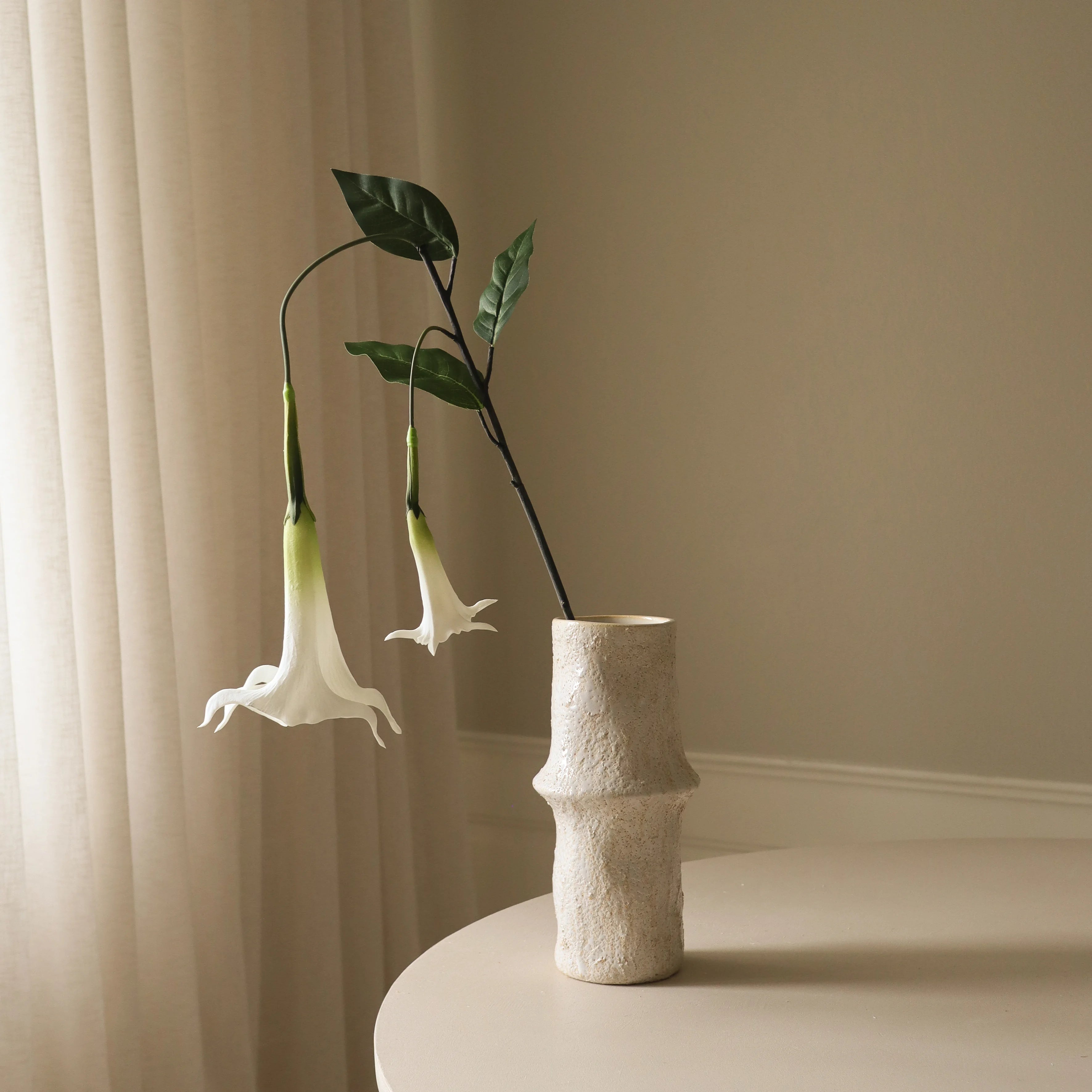 This White Large Datura Stramonium Flower showcases elongated, trumpet-shaped blooms that fade from pale green at the base to soft white at the edges, with gently curled petals adding texture. The slender, arching stem measures 84 cm in height and is adorned with deep green, slightly veined leaves that extend naturally along its length.