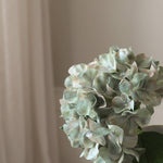 This Pale Green Short Hydrangea Flower features a full, rounded bloom composed of numerous delicate petals in muted green tones with subtle hints of earthy brown. The layered petals create a soft, voluminous texture. The flower is supported by a sturdy green stem measuring 34 cm in height, accompanied by a single deep green leaf.