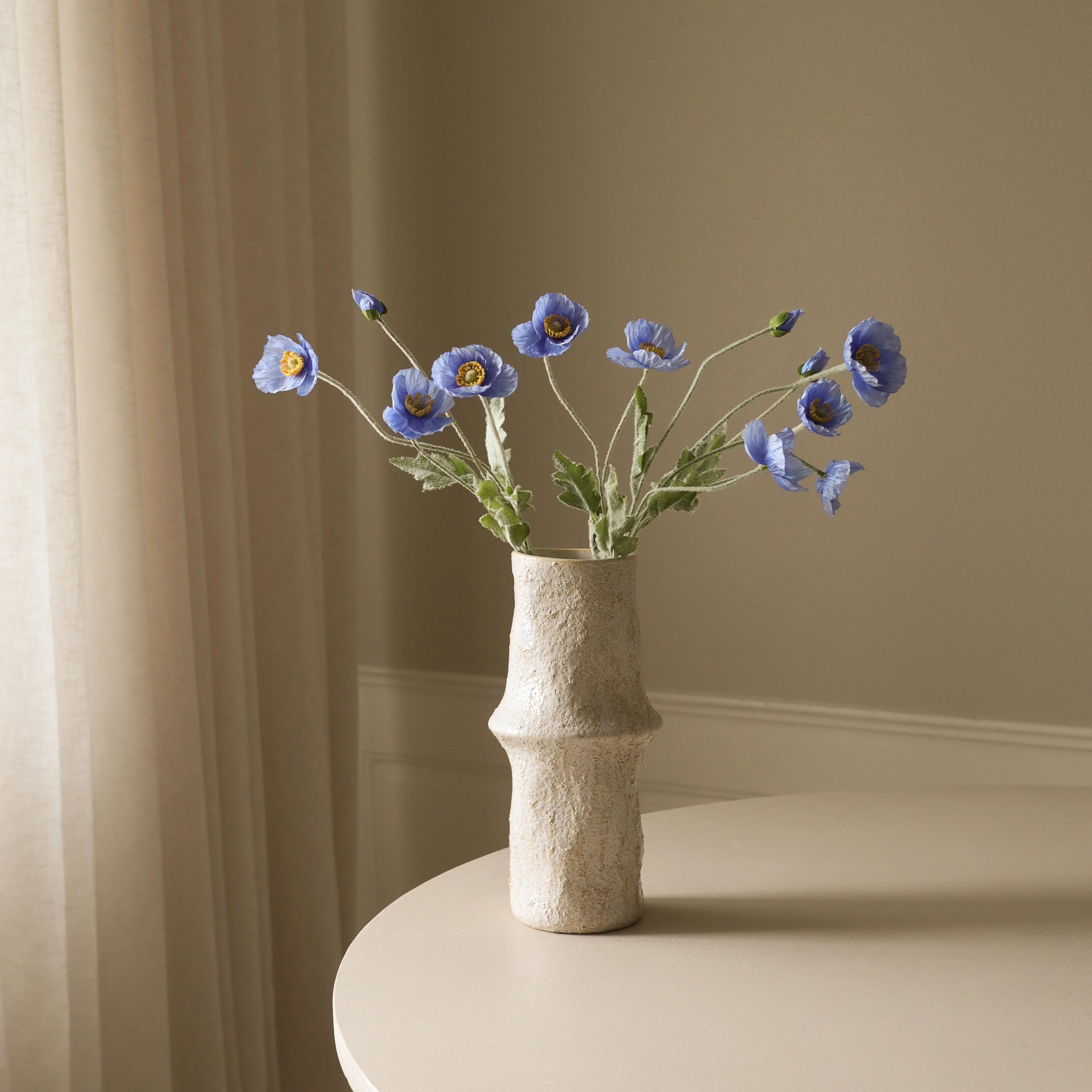 This Blue Poppy Flower has three vibrant blue flower heads with bright yellow centers. The petals are soft and slightly textured, giving the flowers a lifelike appearance. The blooms are supported by a single, slender green stem with fuzzy green leaves, reaching a height of 56 cm.