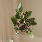 This Green Seeded Eucalyptus Leaves stem features multiple branches with muted green, elongated leaves in varying shades, with a soft texture and a matte finish. Small clusters of dark seeds are interspersed among the leaves. The leaves are attached to a slender, green stem and reach a height of 45 cm.