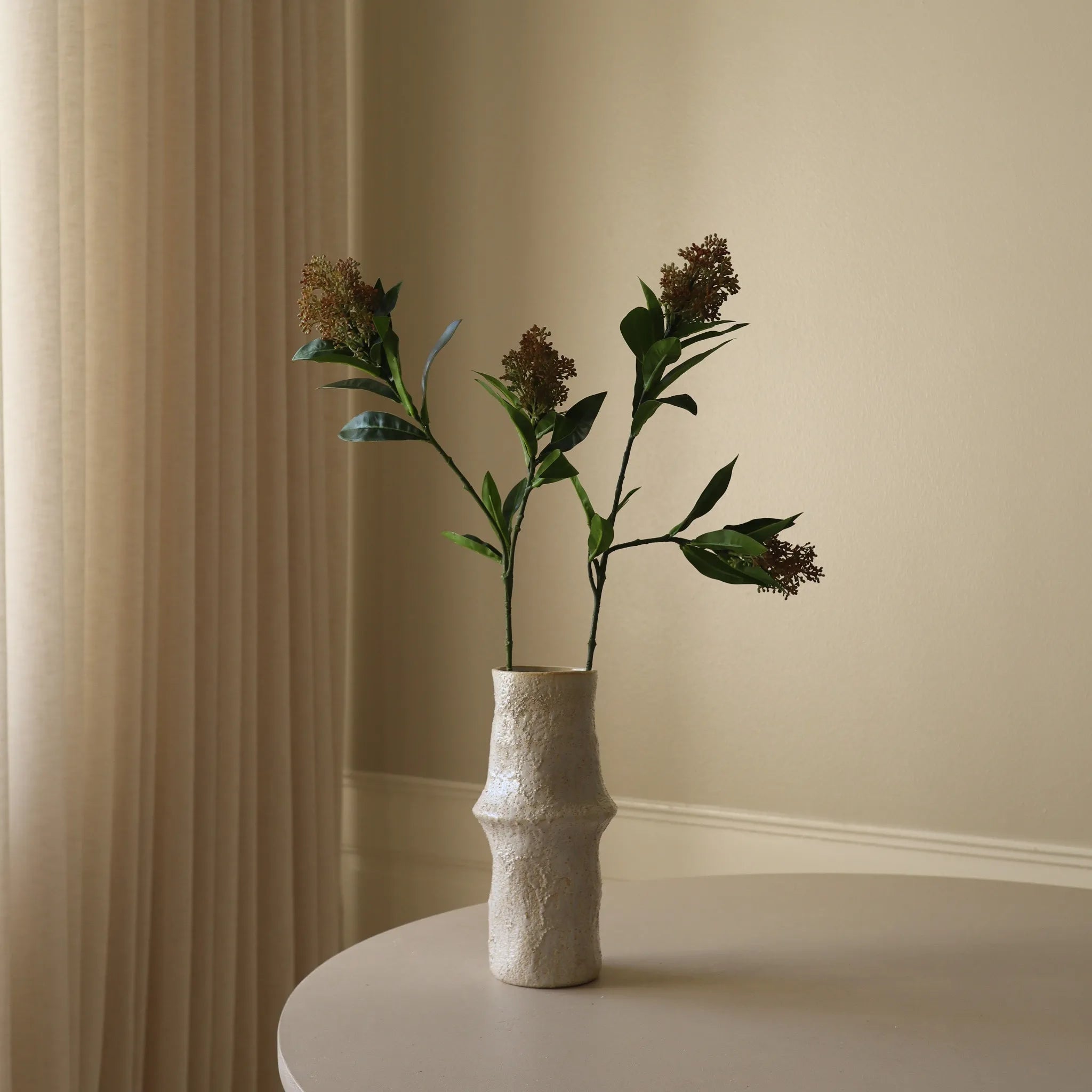 This Rose Skimmia Berry Branch has a natural appearance with clusters of small, rounded berry heads in a muted rose shade with hints of burgundy. The berry clusters are supported by slender, green stems with a matte finish, accompanied by elongated, glossy leaves in a deep green color. The height of the stem is 73 cm.
