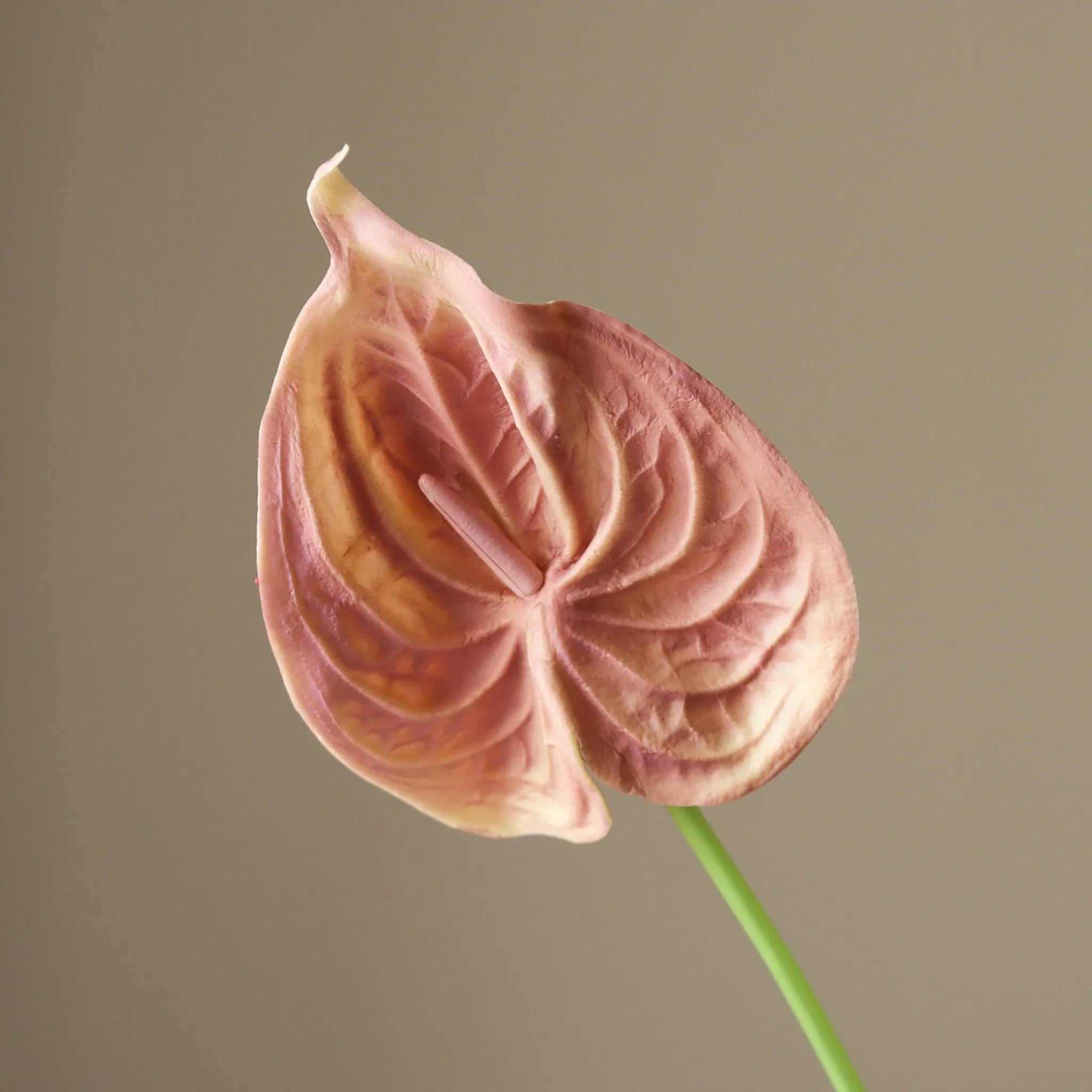 This Rose Small Anthurium Flower has a single structured bloom in muted rose tones with soft golden undertones and deep veining. The central spadix blends seamlessly with the surrounding spathe, which curves gently at the edges. The bloom is supported by a smooth, arching green stem, measuring 65 cm in height.