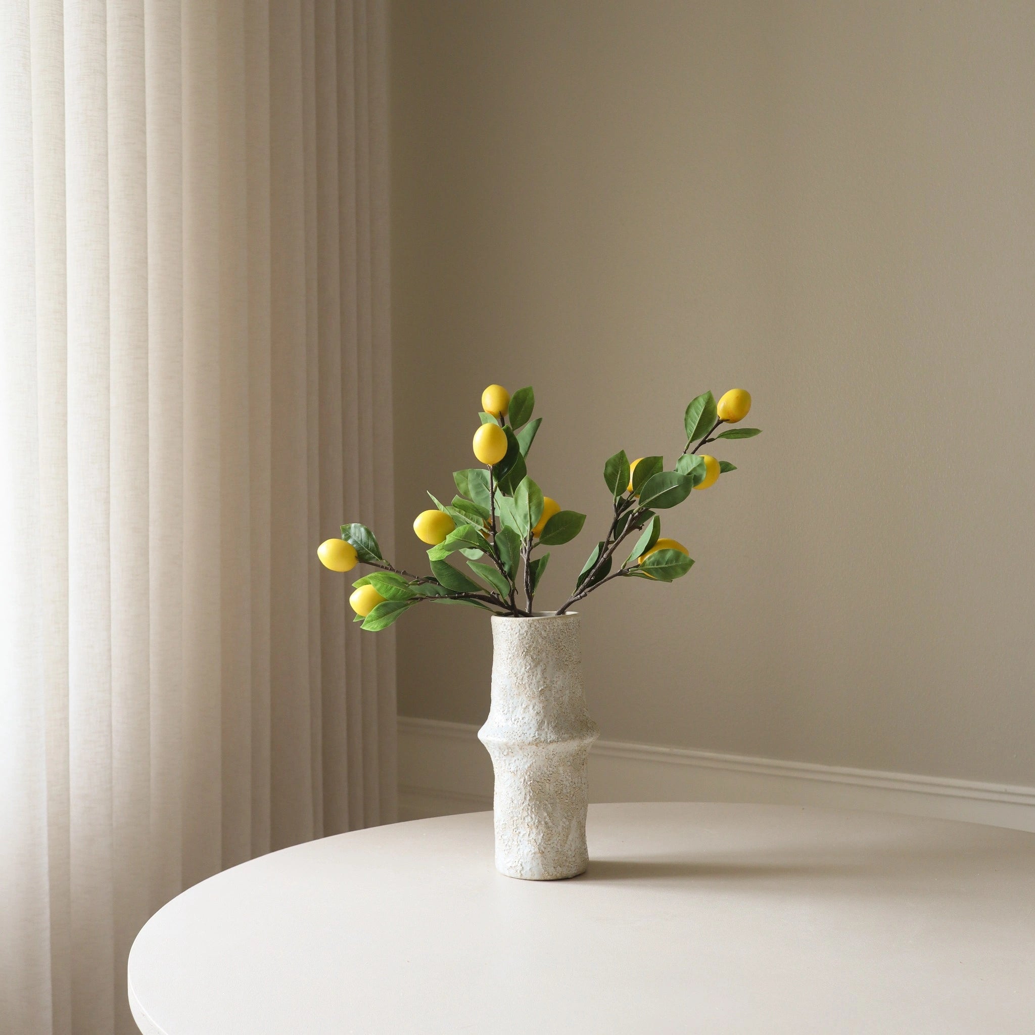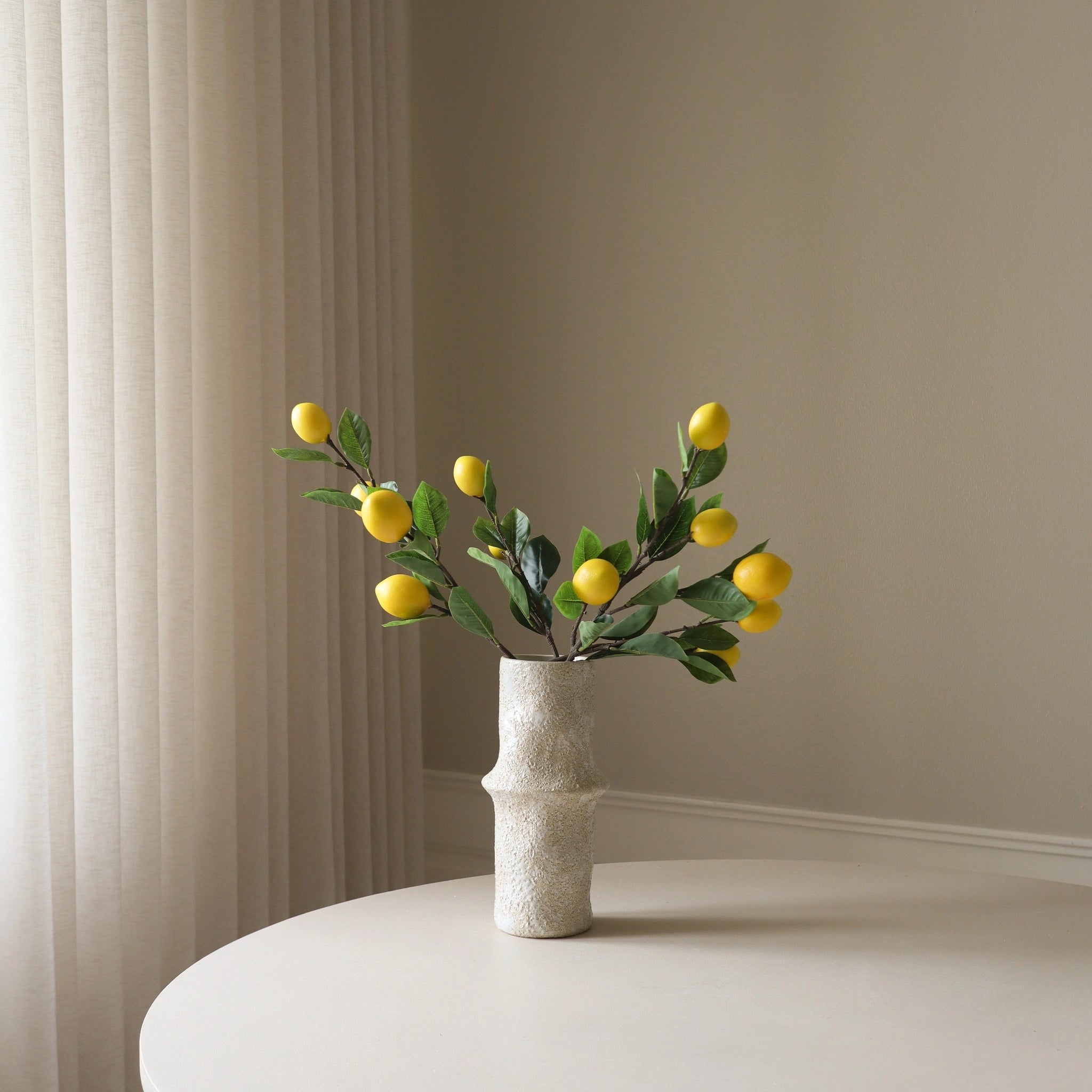 This bouquet showcases two yellow lemon branches, bringing a fresh and vibrant touch to any setting. The realistic lemons contrast beautifully with the deep green leaves and textured branches, adding a natural and organic feel.