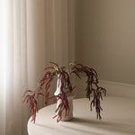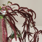 This Dark Red Amaranthus Cruentus Flower displays cascading clusters of deep red, velvety blossoms with a soft, textured surface. The flowers extend from slender, slightly curved branches, accompanied by small, rounded green leaves near the base. The blossoms are arranged on thin, slightly glossy dark stems, which measure 78 cm in height, with subtle branching and a natural arching form.