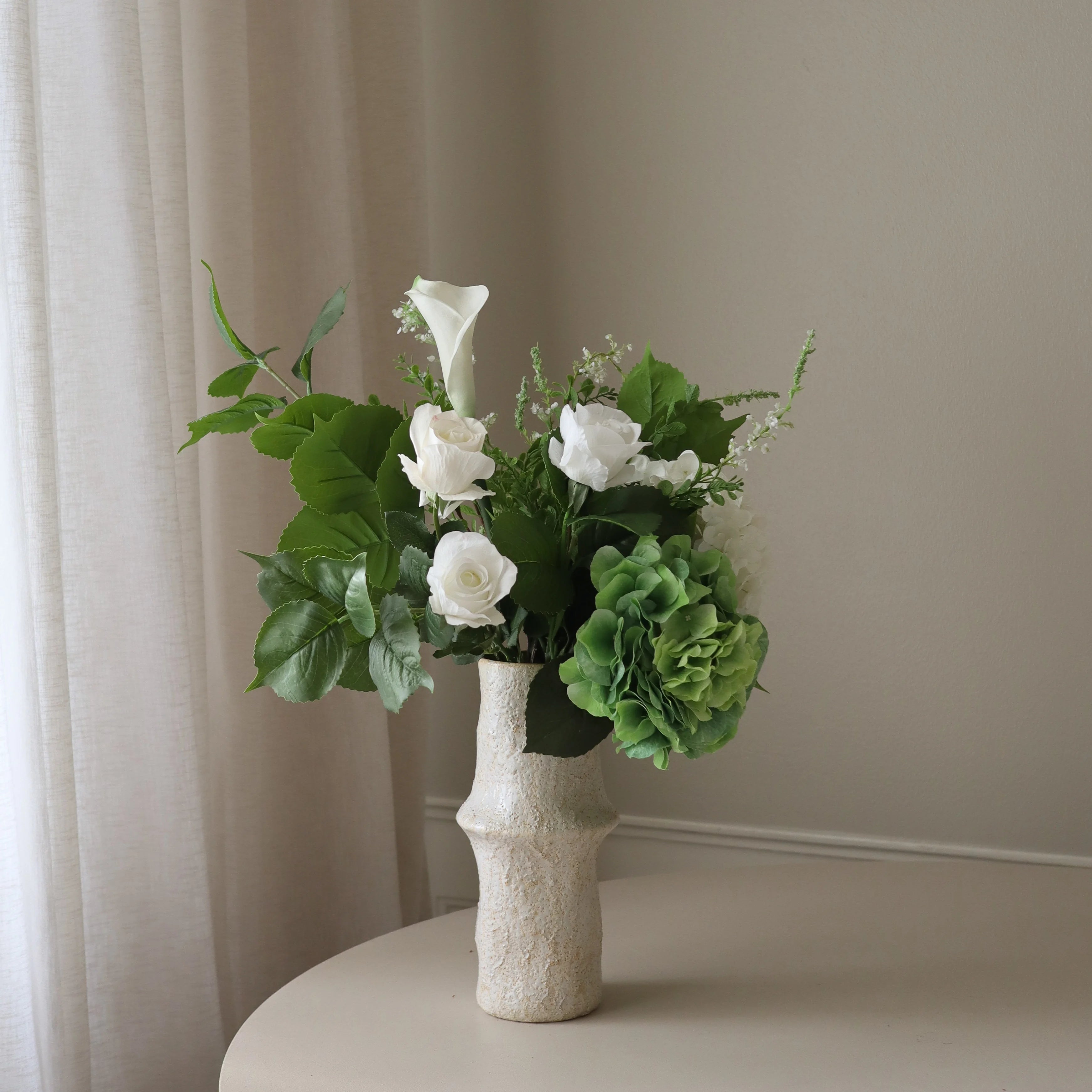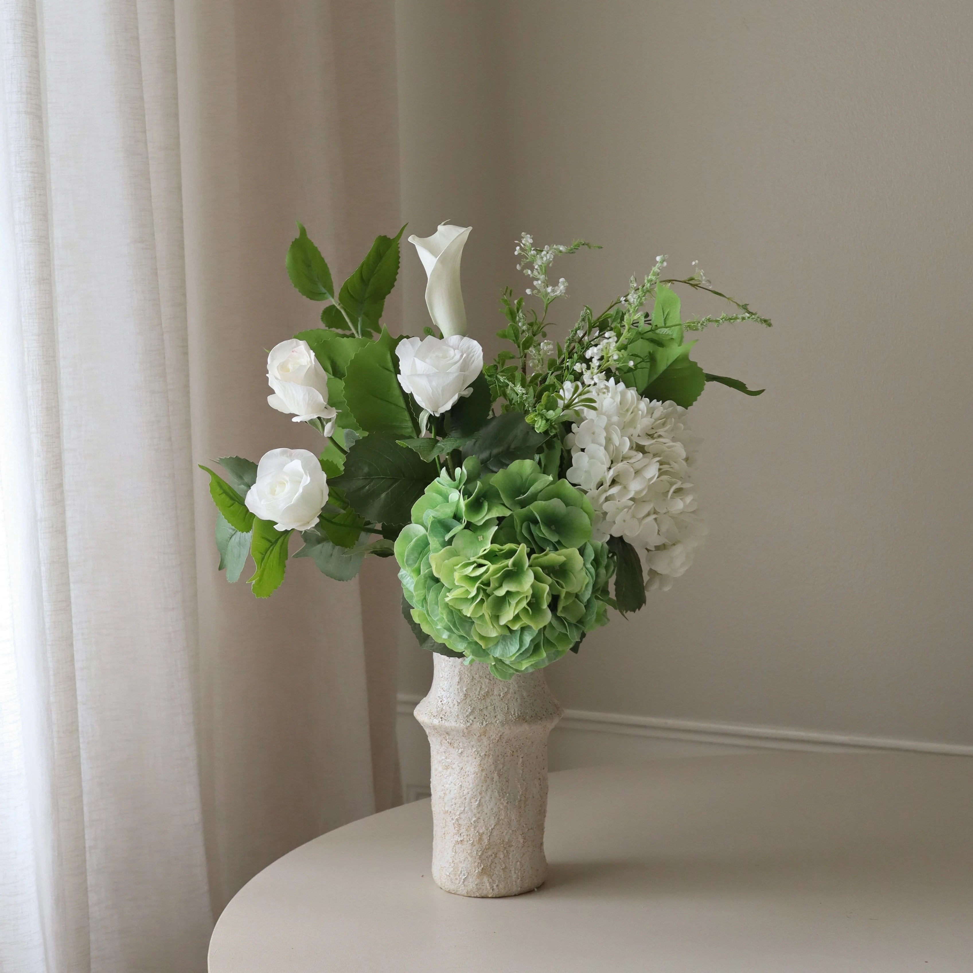 This bouquet showcases a fresh and airy composition of green and white hydrangeas paired with white roses and delicate foliage, creating a light and timeless botanical expression.