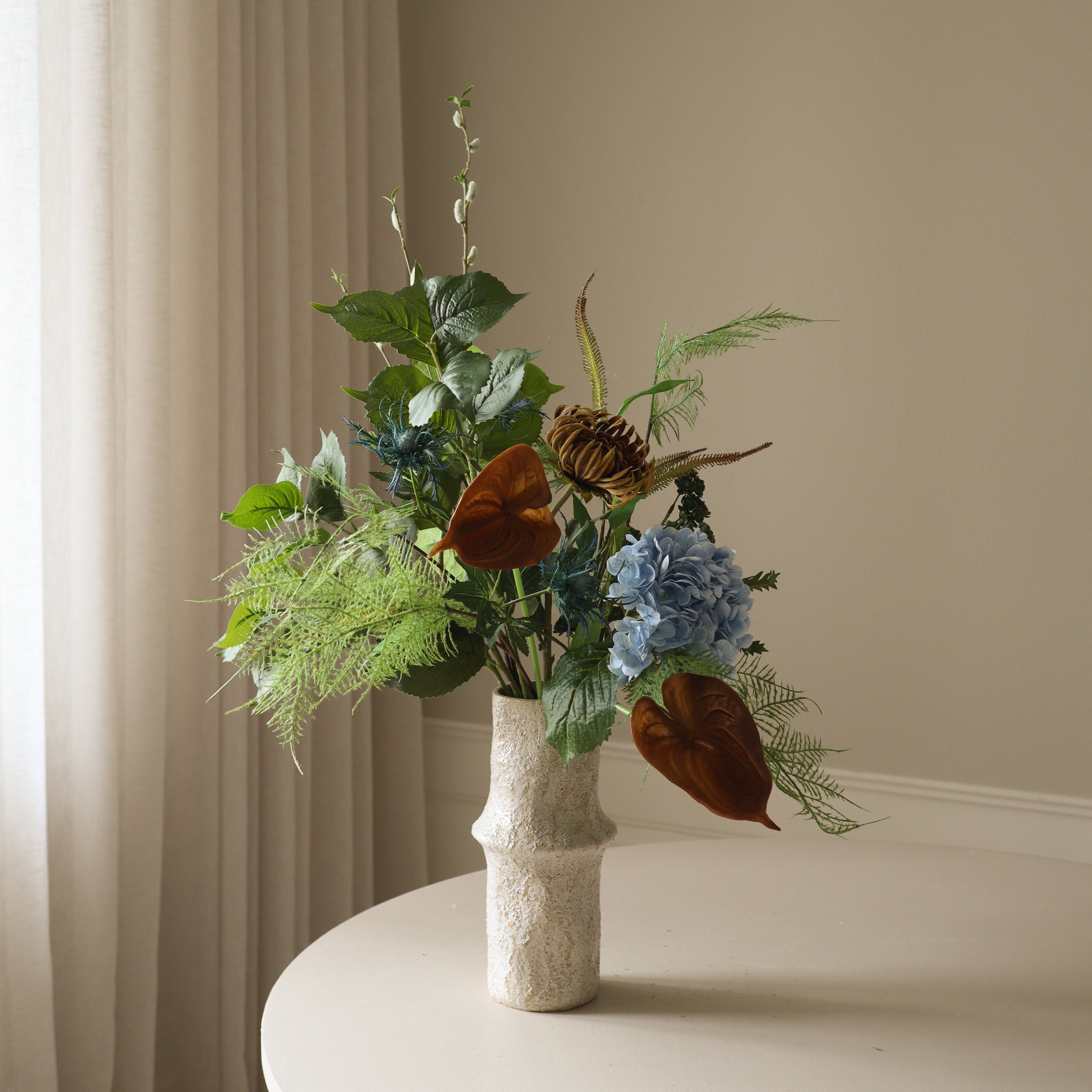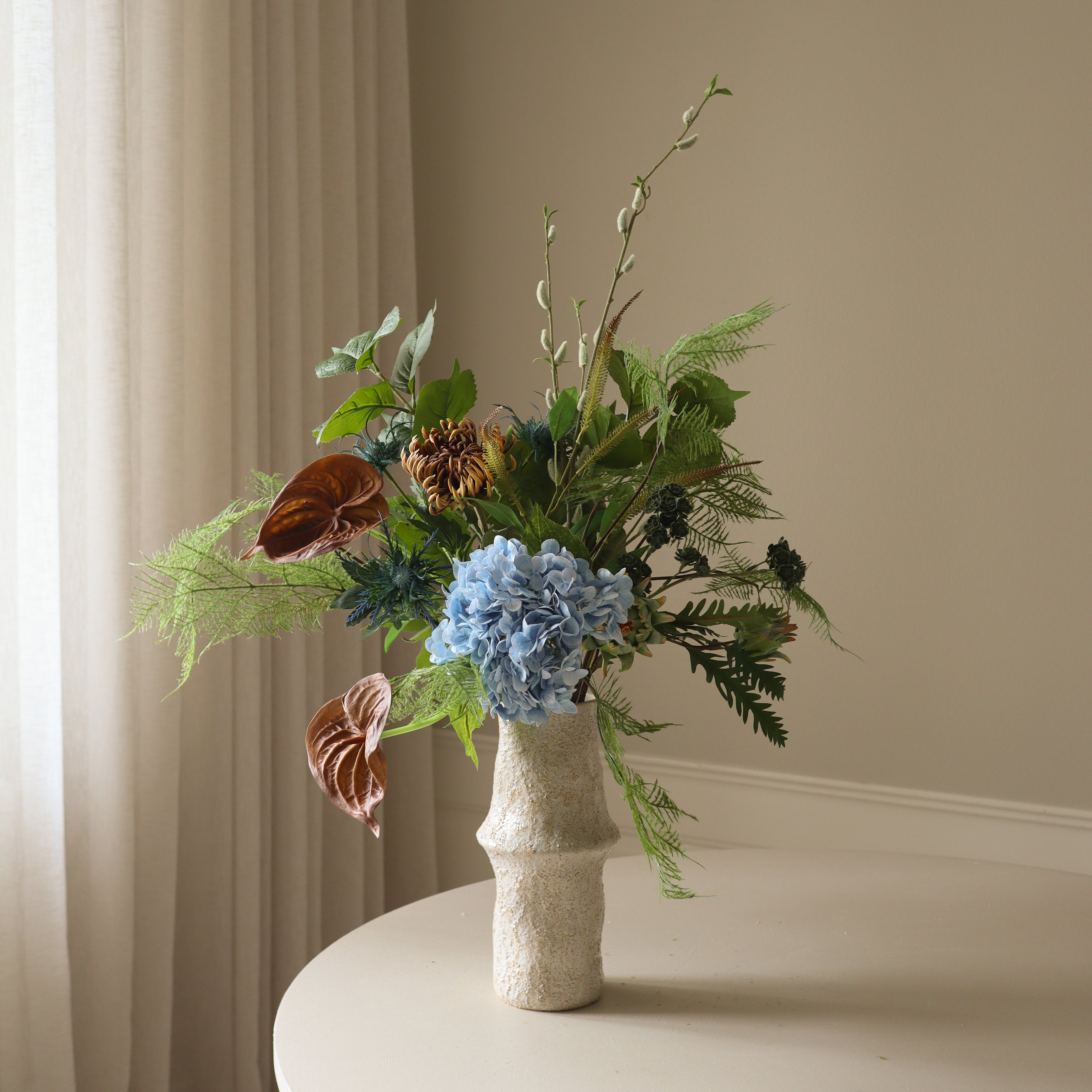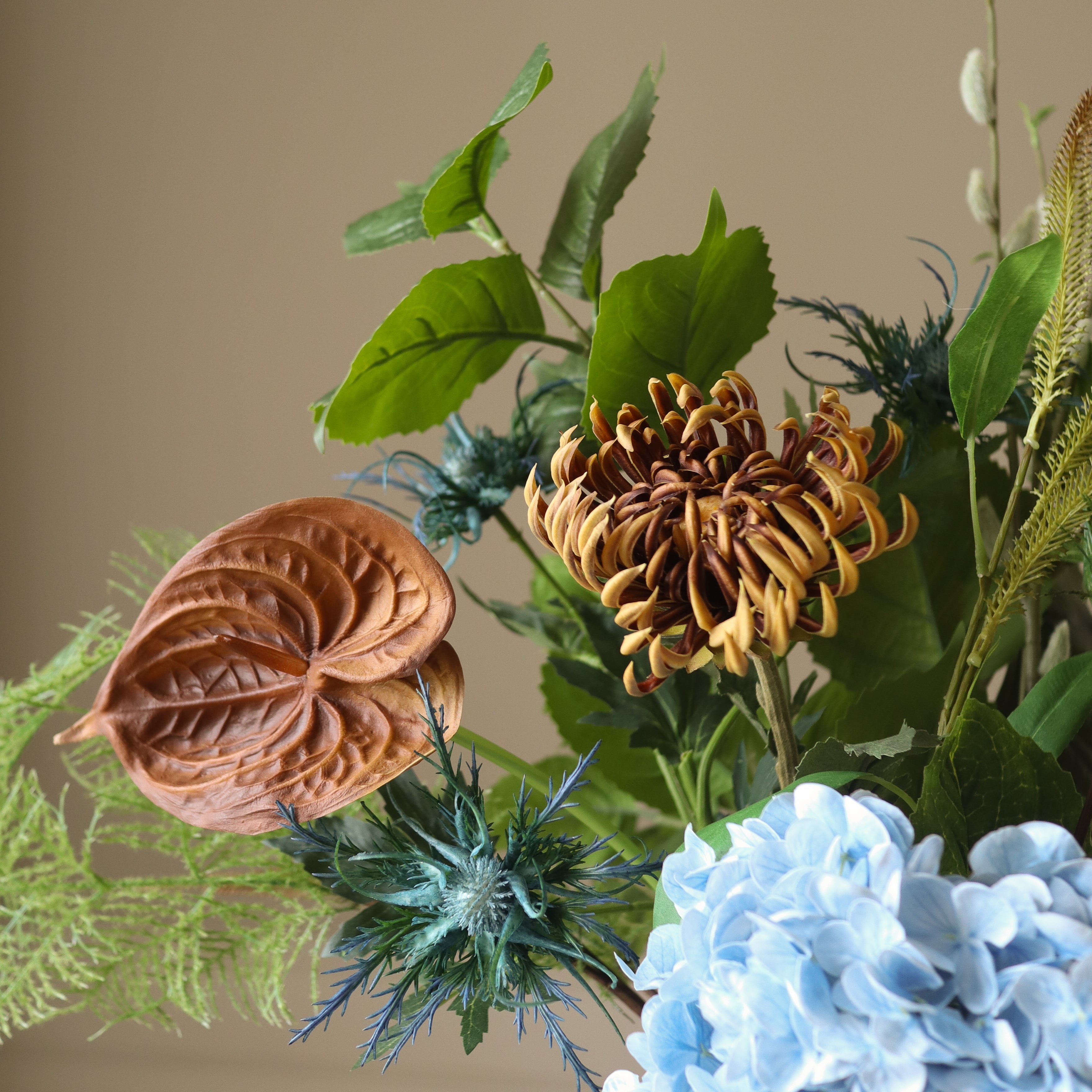 This bouquet blends earthy tones and cool blues. The light blue hydrangea serves as a focal point, contrasting against the deep greens of the ferns and hydrangea leaves. Rich brown semi-cactus dahlias and small anthuriums introduce warm, grounding hues, while the spiky blue thistle and artichoke branch add depth and texture. The cascading willow bud branch and orange mini amaranthus complete the arrangement with organic movement.
