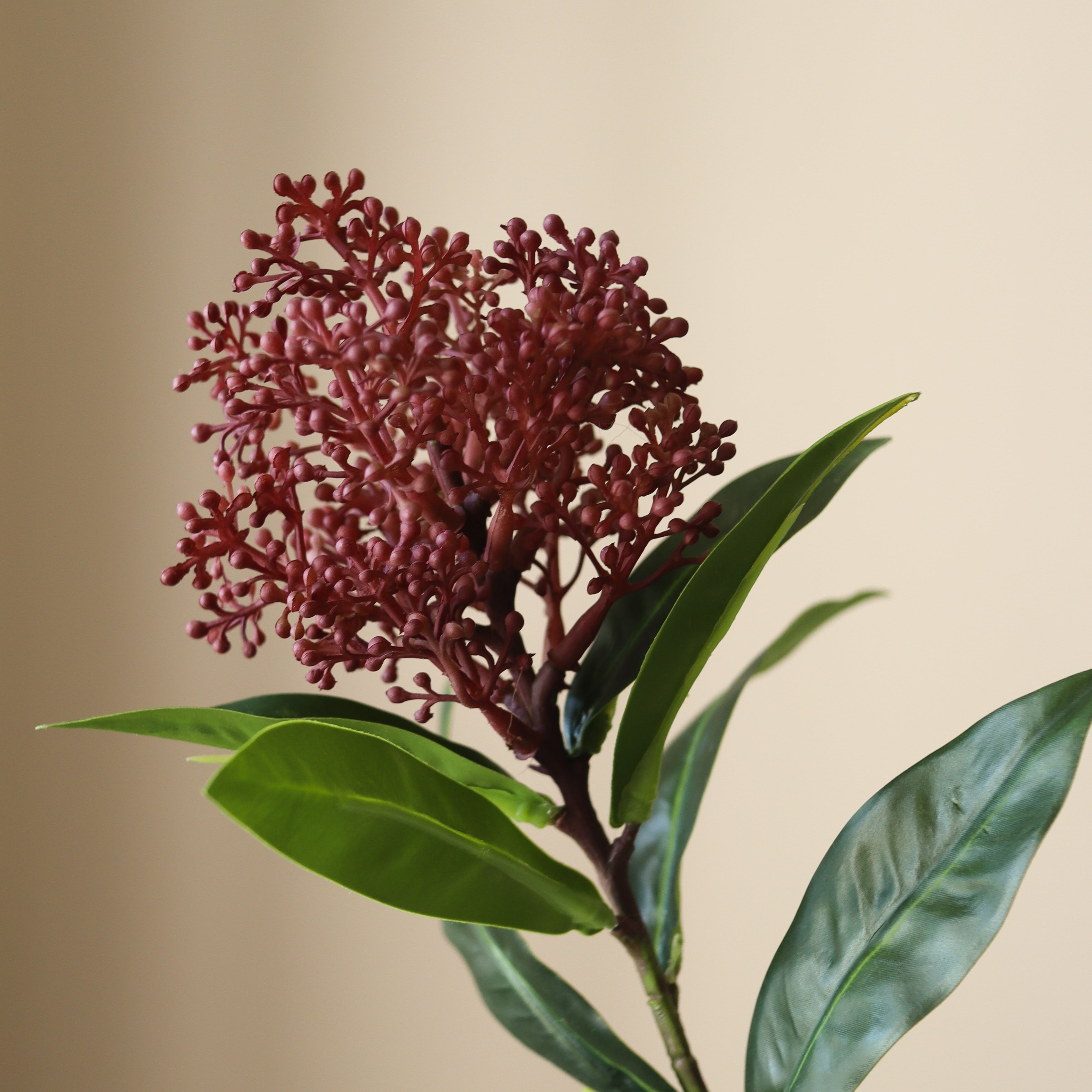 This Purple Skimmia Berry Branch has a detailed design that closely resembles fresh skimmia berries. The branch features two clusters of small, textured berry heads in a deep purple shade with subtle burgundy undertones. The long, slender green leaves add a contrasting touch with a smooth, slightly glossy surface. The height of the stem is 73 cm.