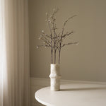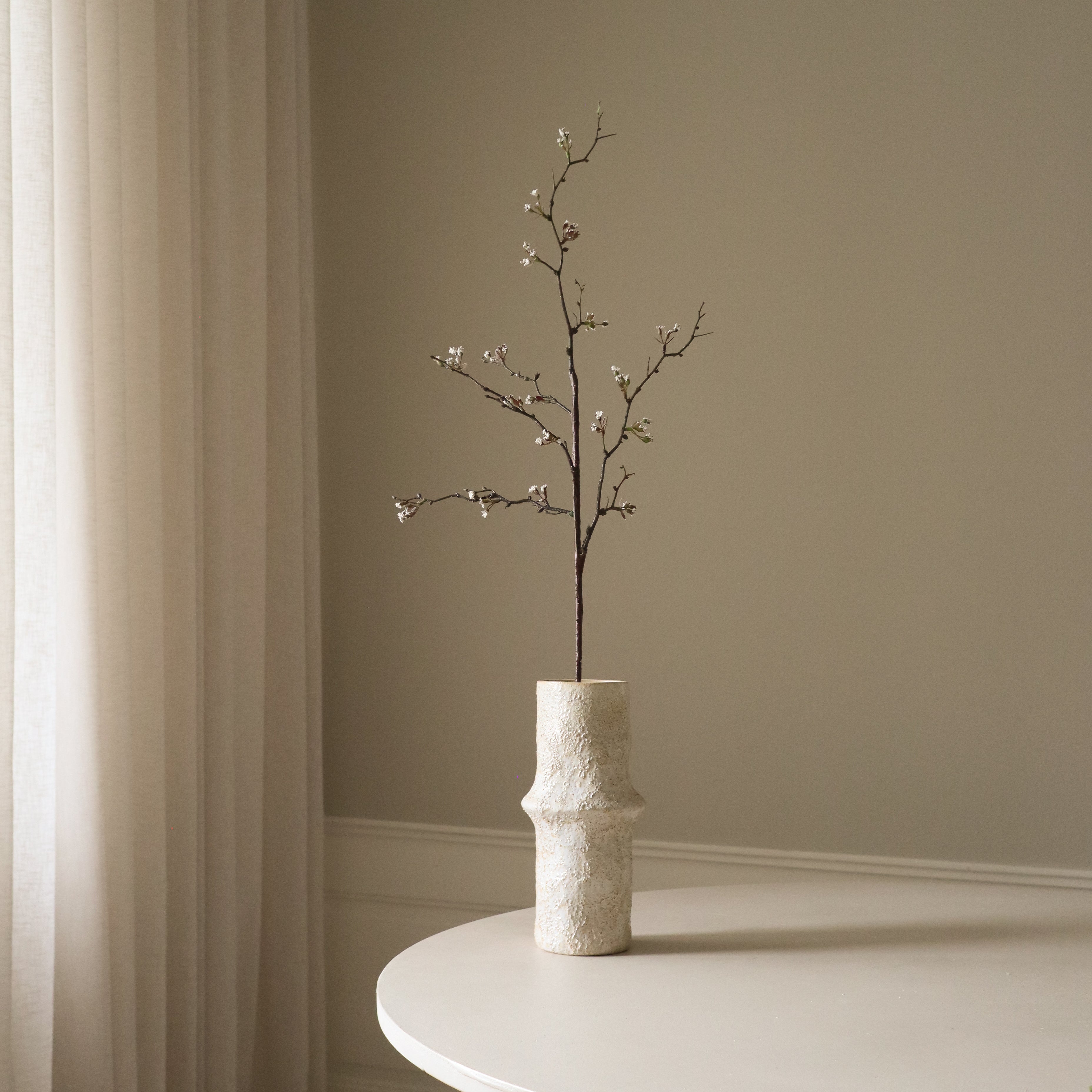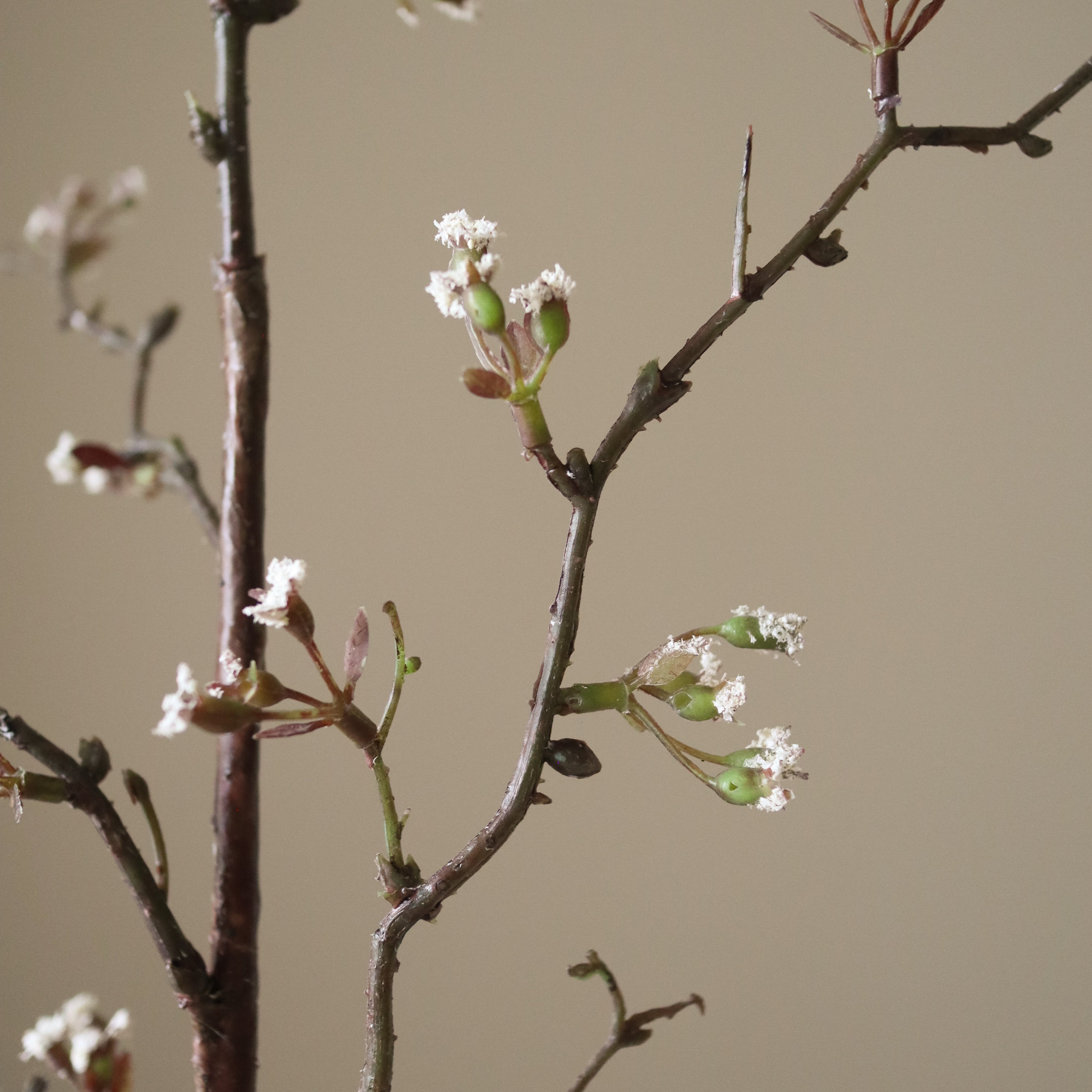 This White Cherry Blossom Branch features delicate white blossoms with subtle green buds on dark, slender stems. The structured branches create a natural, airy silhouette with small blossoms emerging at various points. The textured dark brown stems measure 96 cm in height, with smaller offshoots adding depth and movement.
