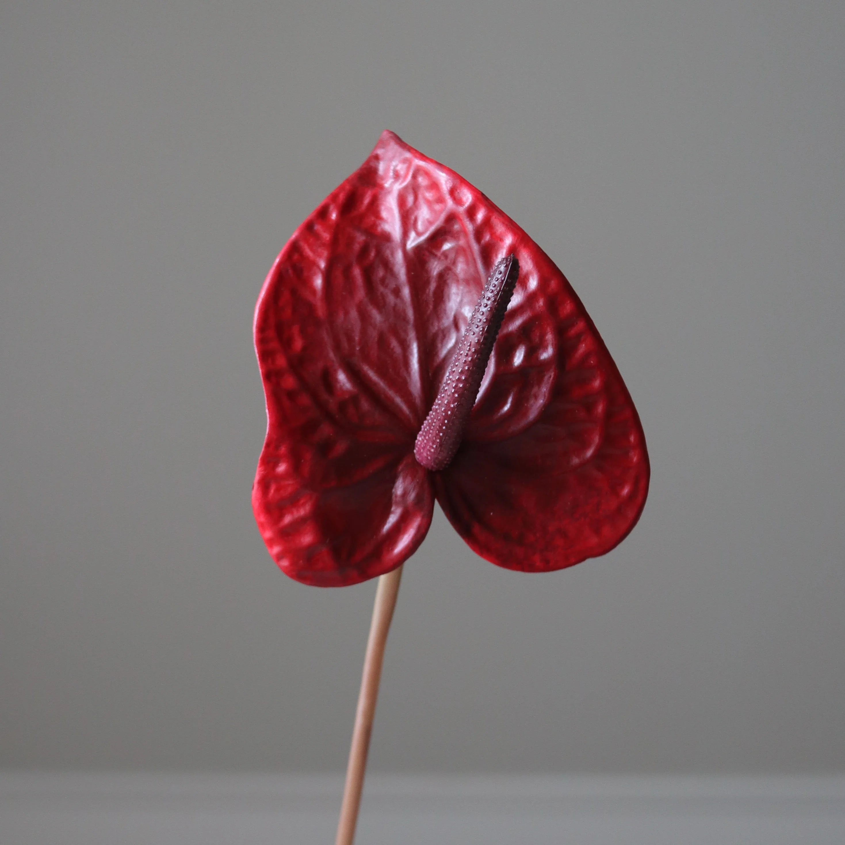 This Red Anthurium Flower features a single, heart-shaped bloom in a rich crimson shade with a glossy, sculptural surface. The flower is supported by a natural-looking stem and measures approximately 63 cm in height.