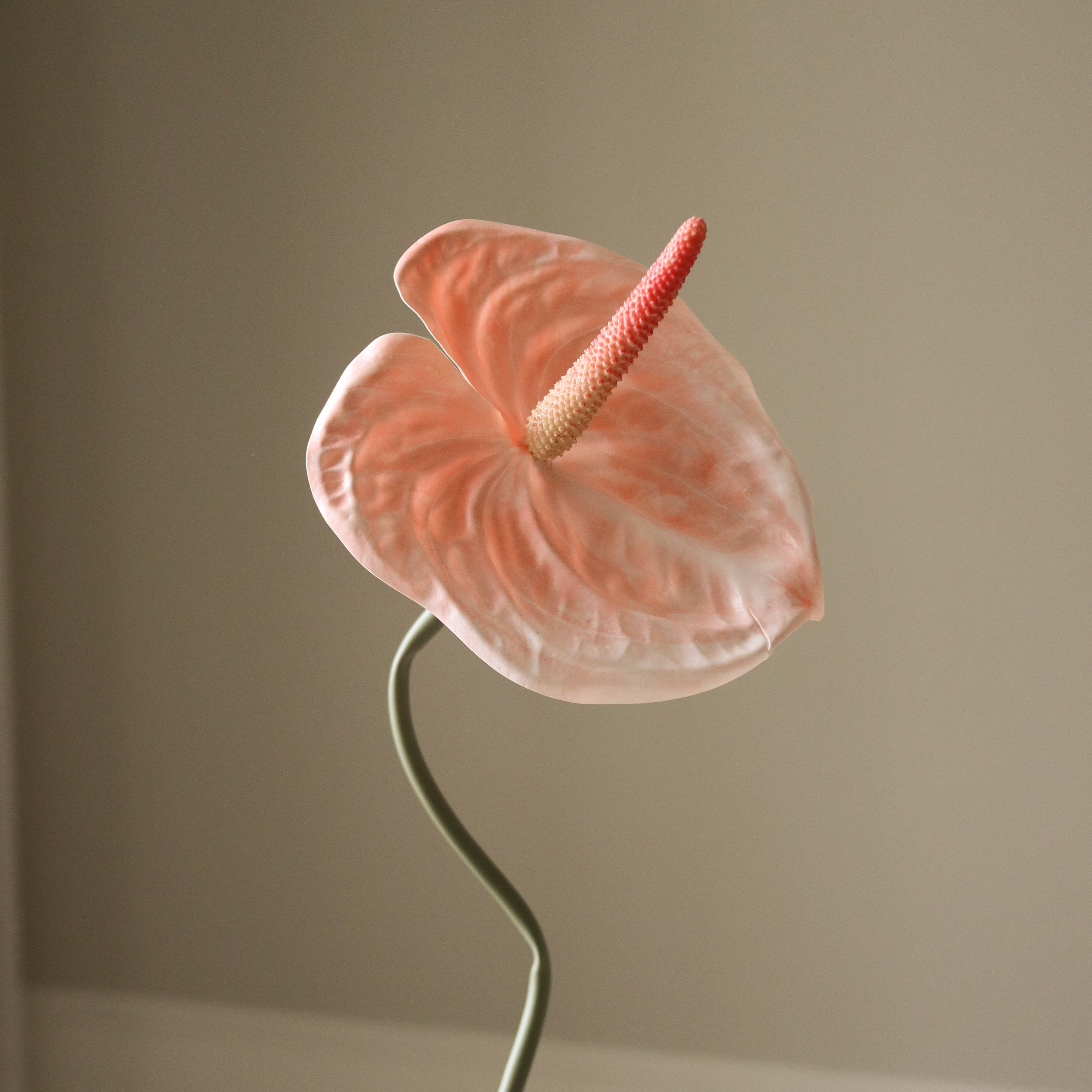 This Coral Anthurium Flower features a single, heart-shaped bloom in a soft coral shade with a textured surface and a central spadix in a gradient of coral to pale yellow. The flower is attached to a slender, curved green stem, reaching a height of 67 cm.