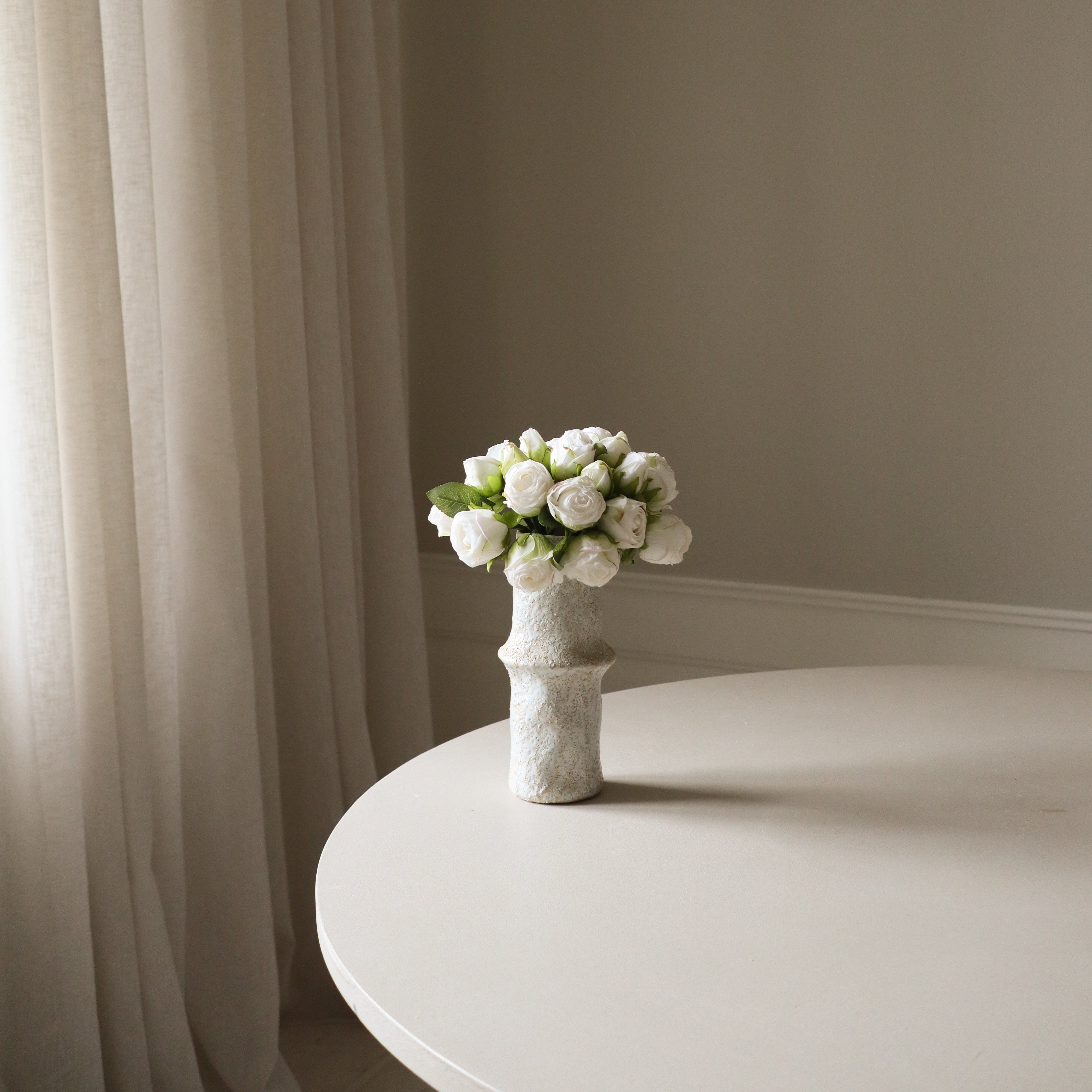 This bouquet features delicate white mini roses in a soft, rounded arrangement, creating a refined and elegant composition. The compact form highlights the lush petals and fresh green foliage, making it a perfect subtle accent.