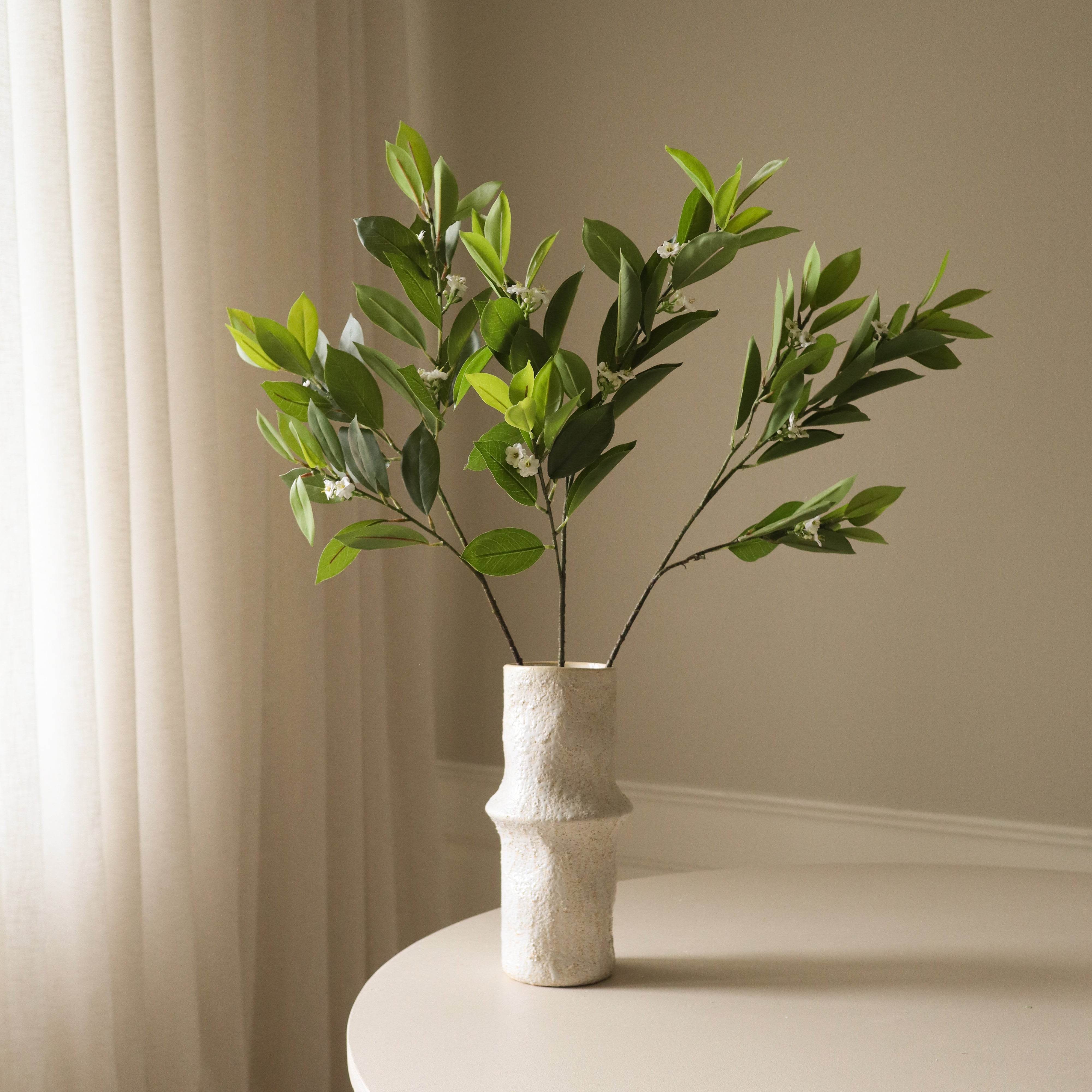 This Green Jasmine Leaves branch features multiple stems with small white flowers and vibrant green leaves. The leaves display a smooth, slightly glossy surface with subtle variations in shade. The branching structure consists of slender, textured green stems that extend upward, reaching a height of 80 cm.