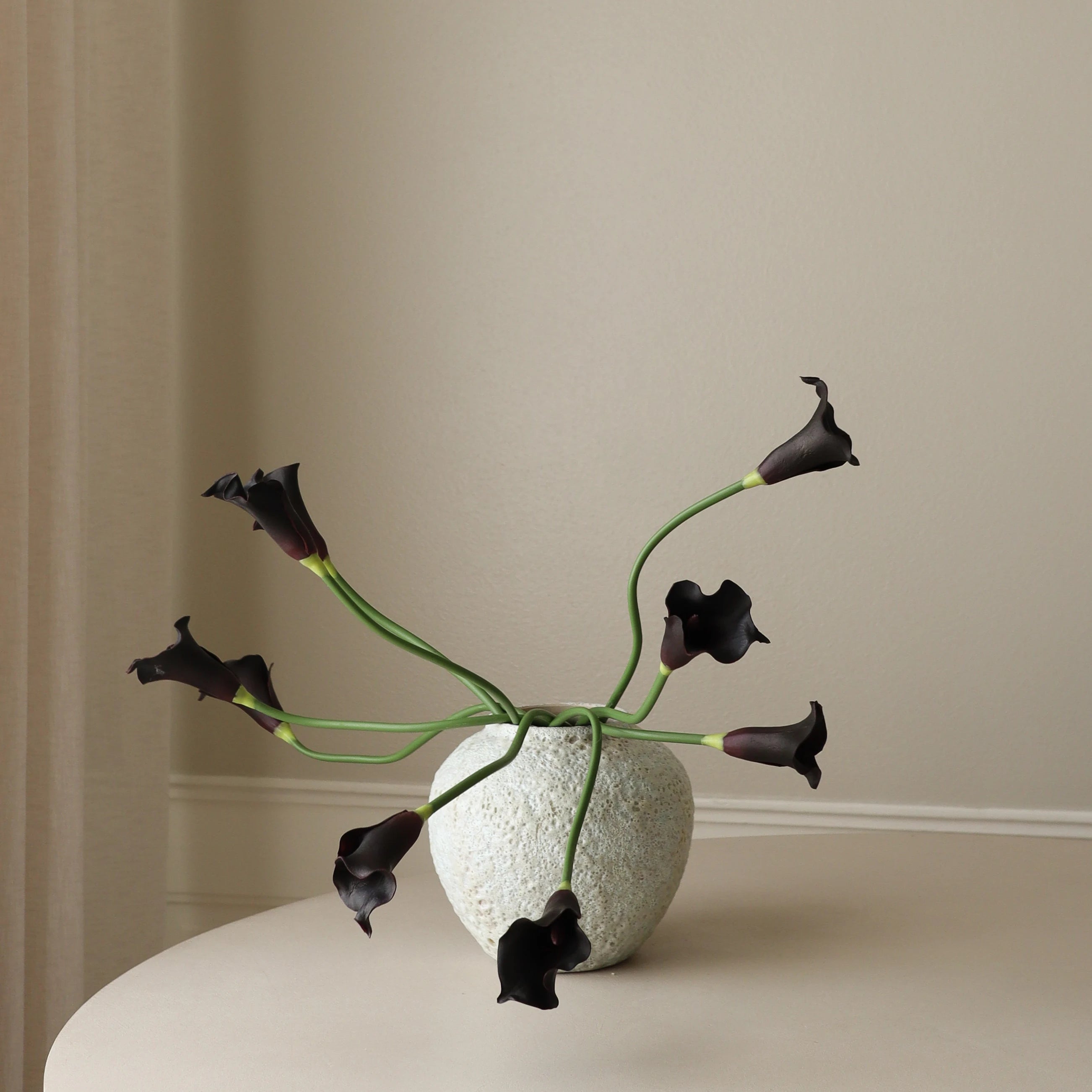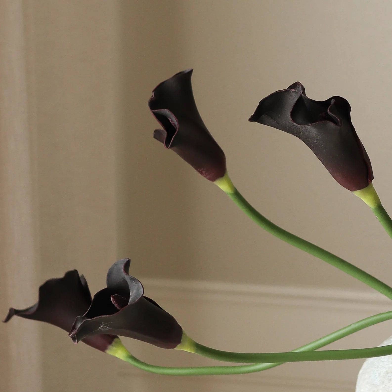 This bouquet showcases a striking arrangement of deep black calla lilies, their sculptural forms and velvety petals creating a bold and contemporary expression.