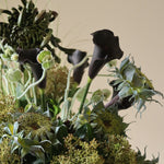 Dark calla lilies intertwine with textured chrysanthemums, green amaranthus, and untamed grasses, creating a statement bouquet with striking depth.