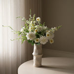 A bouquet of crisp white blooms with soft yellow centers, paired with fresh green accents that add lightness and movement. The airy, sculptural flowers create a serene composition that feels both timeless and uplifting.