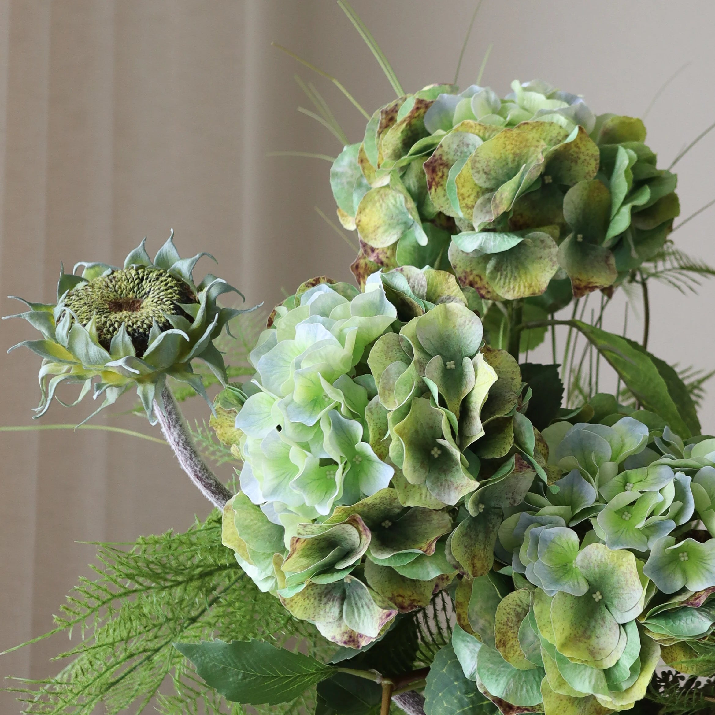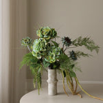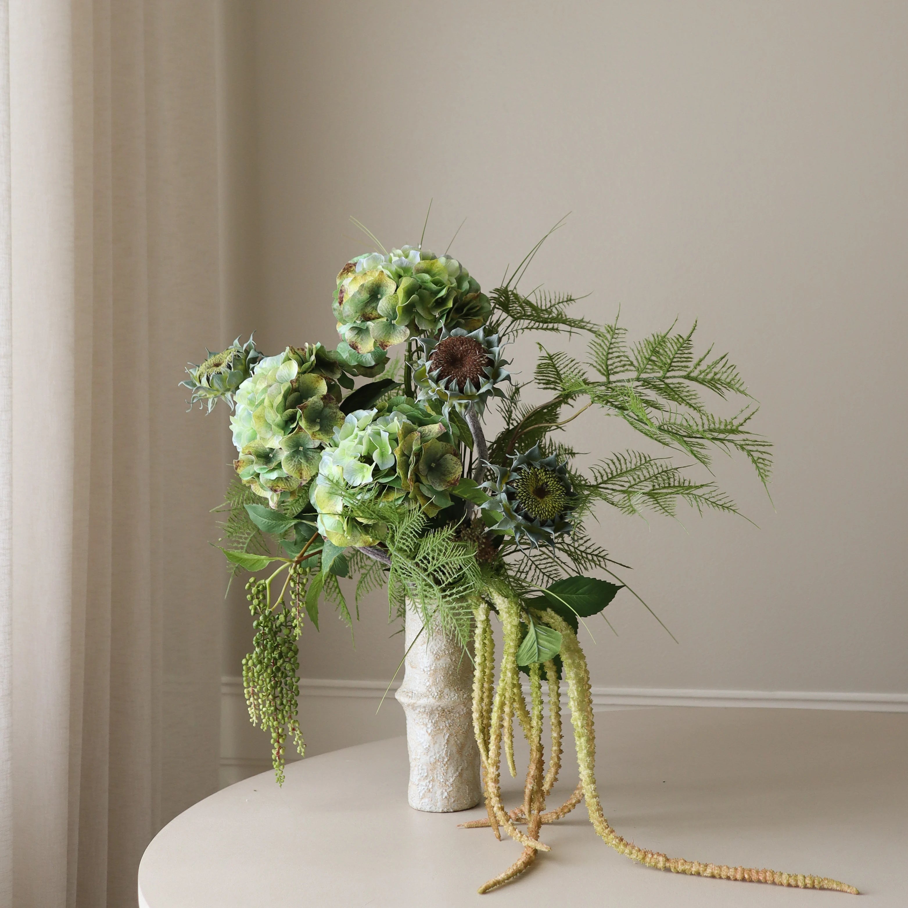 This bouquet showcases a fresh harmony of soft green hydrangeas, airy grasses, and cascading foliage. The layered textures and sculptural forms create a natural, garden-inspired arrangement with an effortless elegance.
