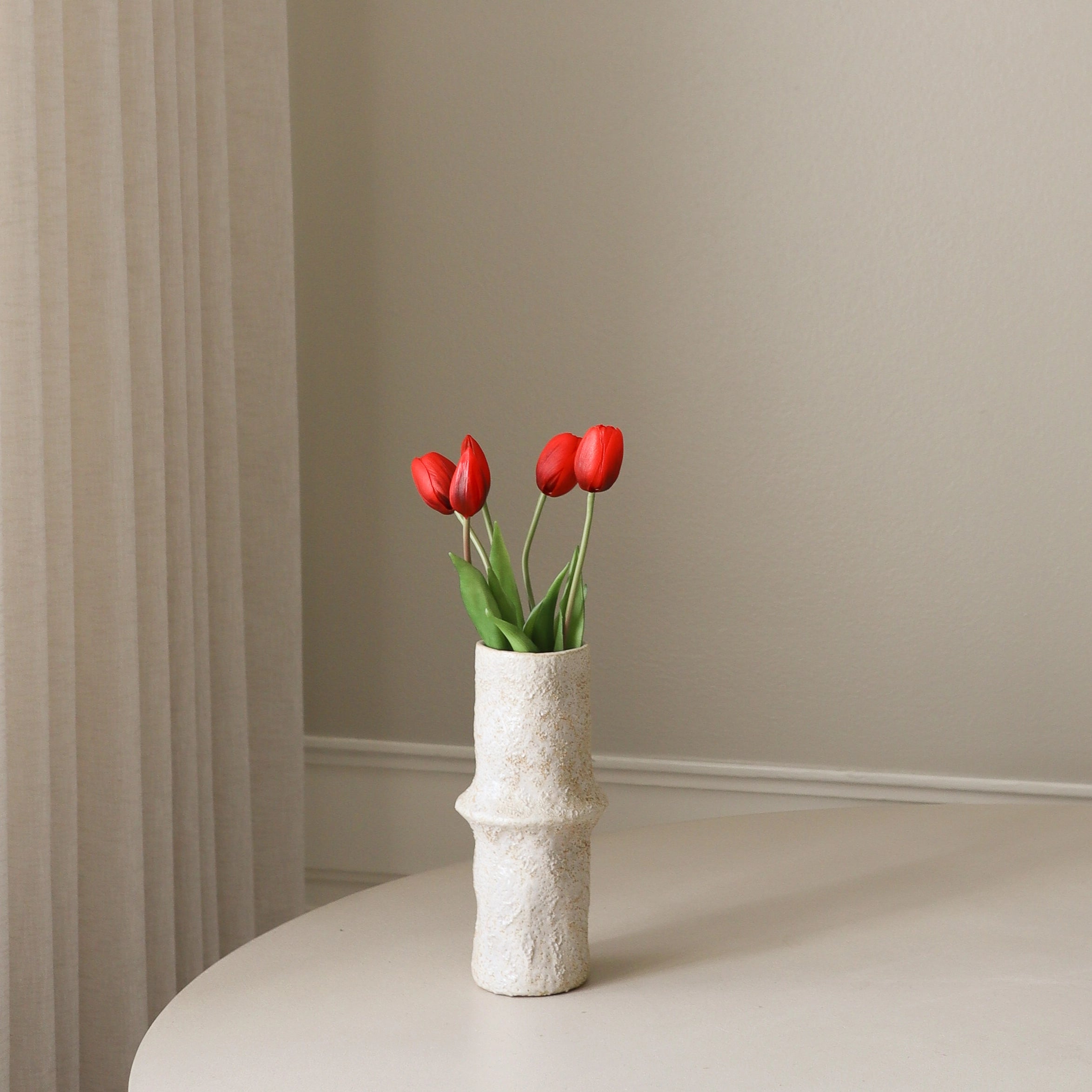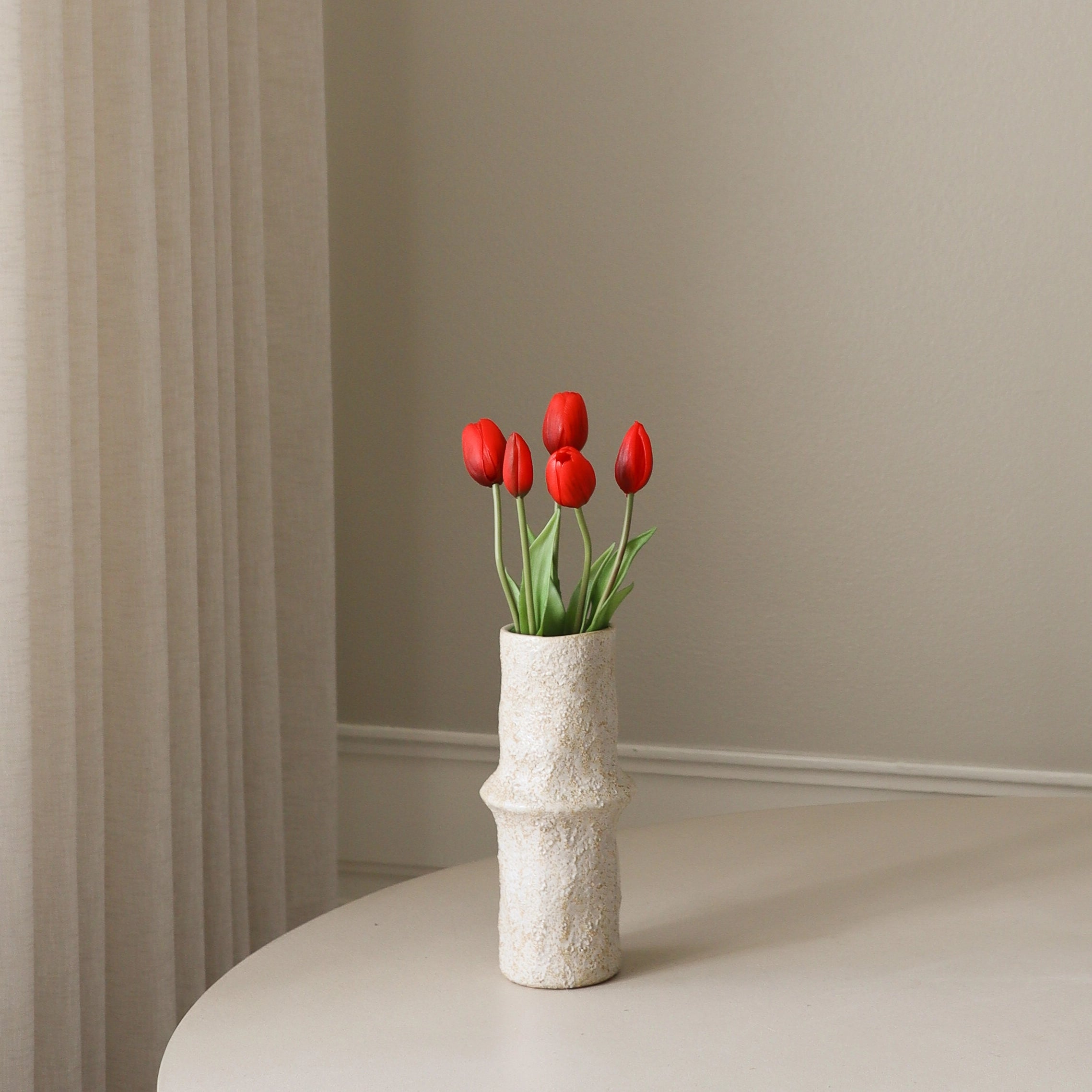The Small Ceramic Earth Vase featured in the image measures 24.5 cm in height and 8 cm in diameter.