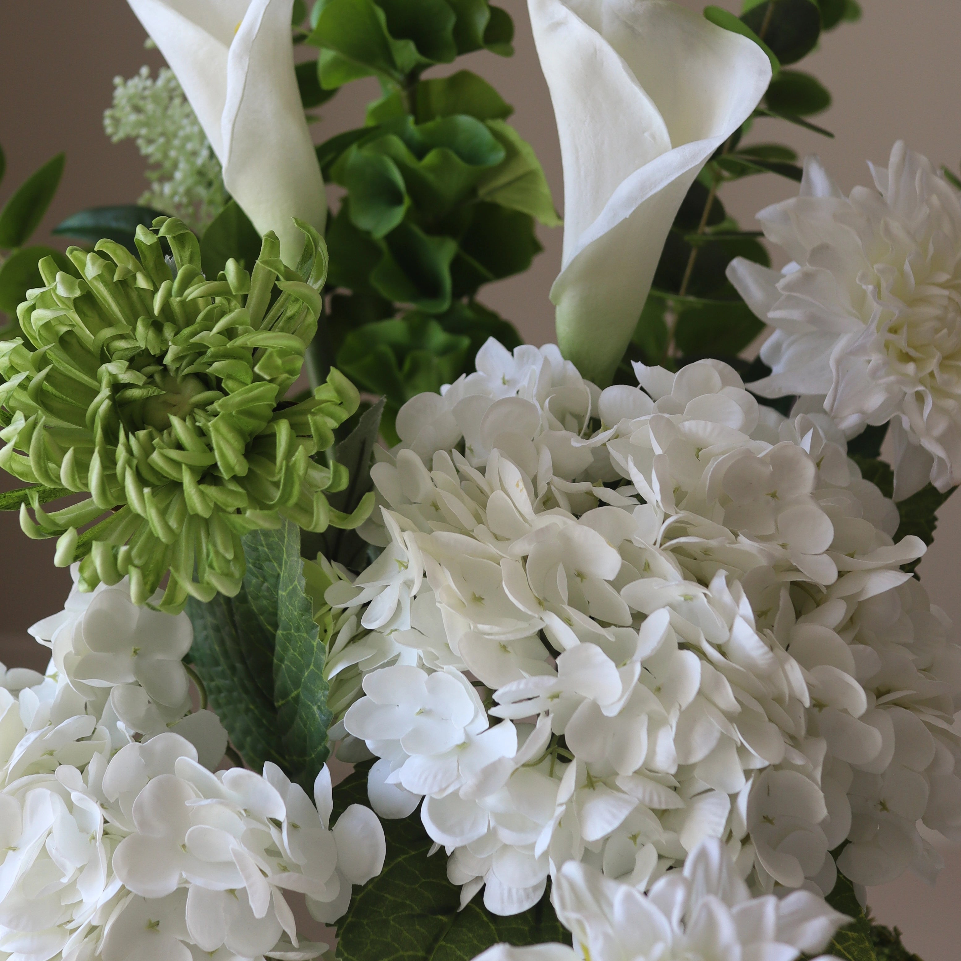 This bouquet features a balanced composition of soft white blooms and fresh green accents. The voluminous hydrangeas provide a lush foundation, complemented by delicate calla lilies and structured dahlias. Textural greenery adds dimension, while cascading elements enhance movement.