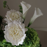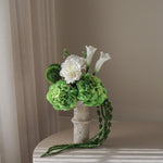 This bouquet showcases a harmonious blend of soft white and layered green tones, combining rounded blooms with sculptural accents and trailing details. The contrast between structured forms and gentle movement creates a serene, architectural composition with a refined, natural presence.