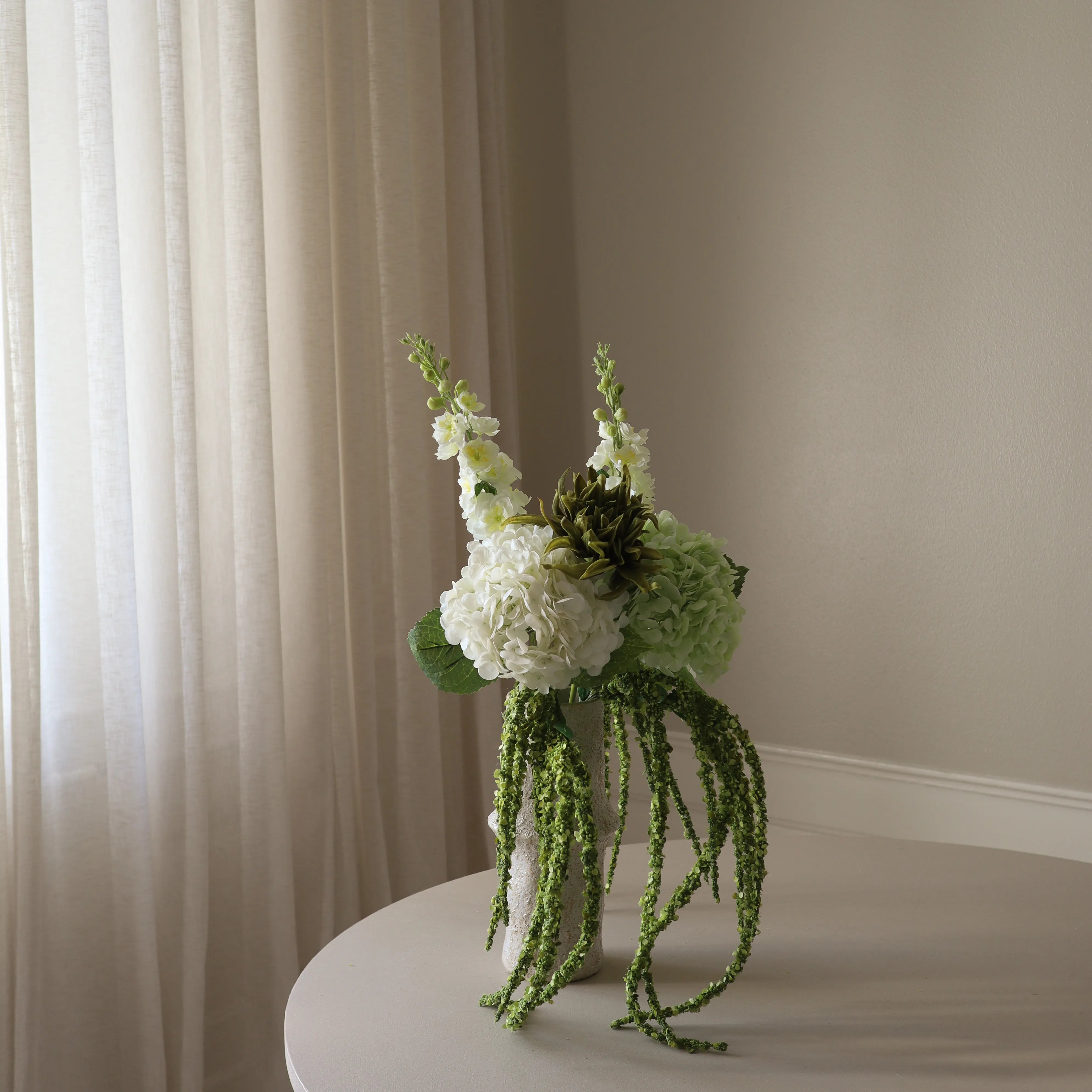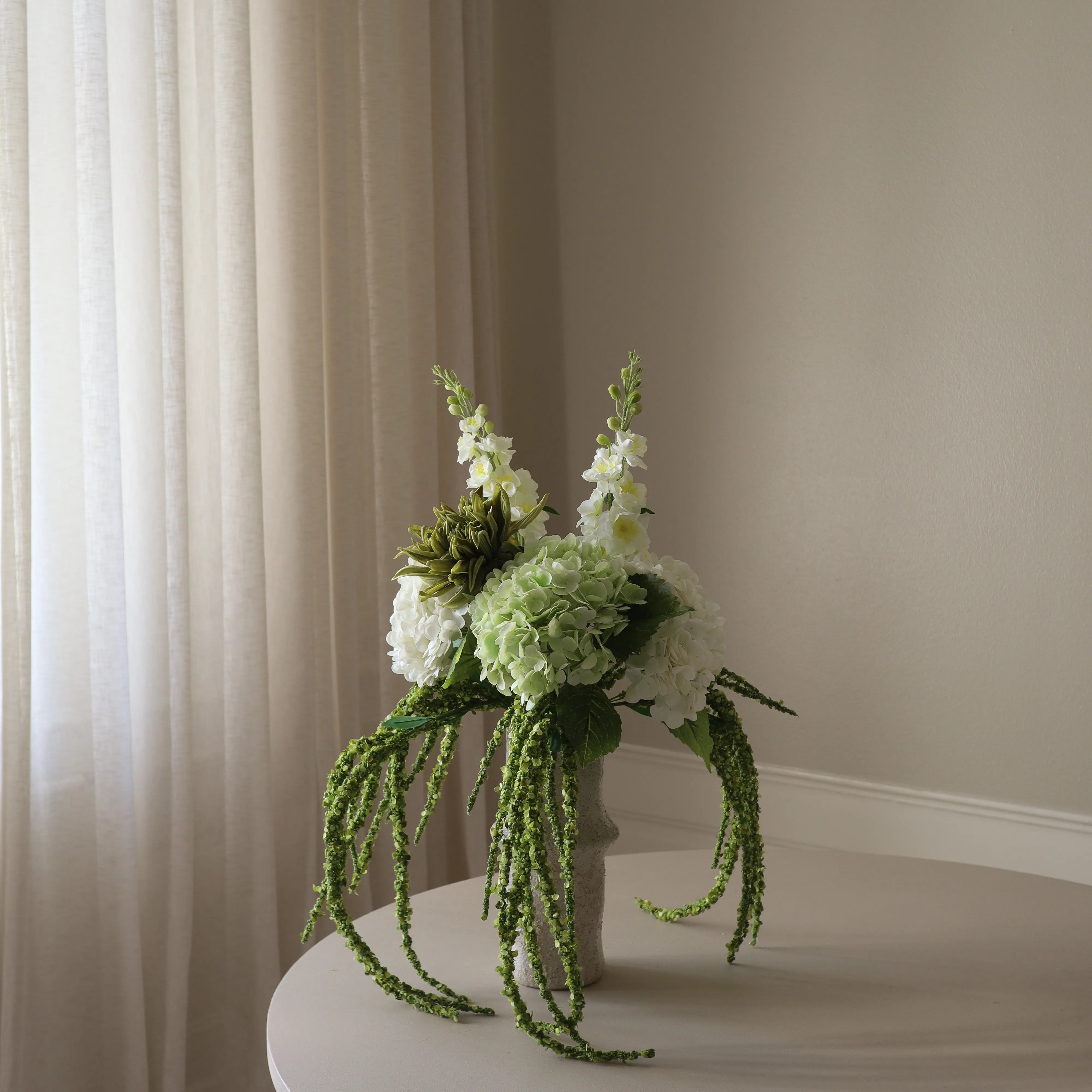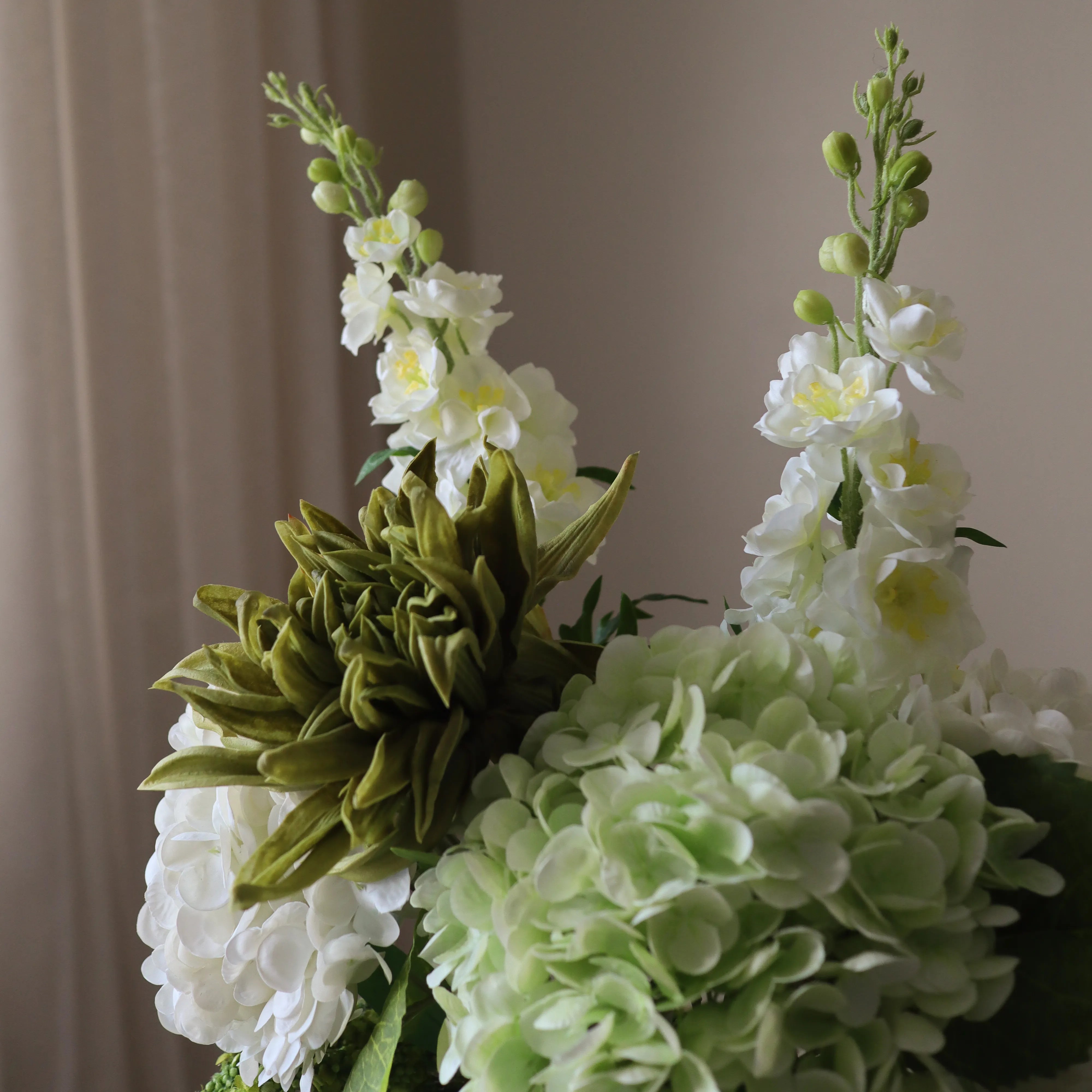 This bouquet features a structured arrangement of white and green tones, blending soft textures with striking silhouettes. Full-bodied blooms create a lush centerpiece, while elongated stems and cascading elements add fluidity and movement.