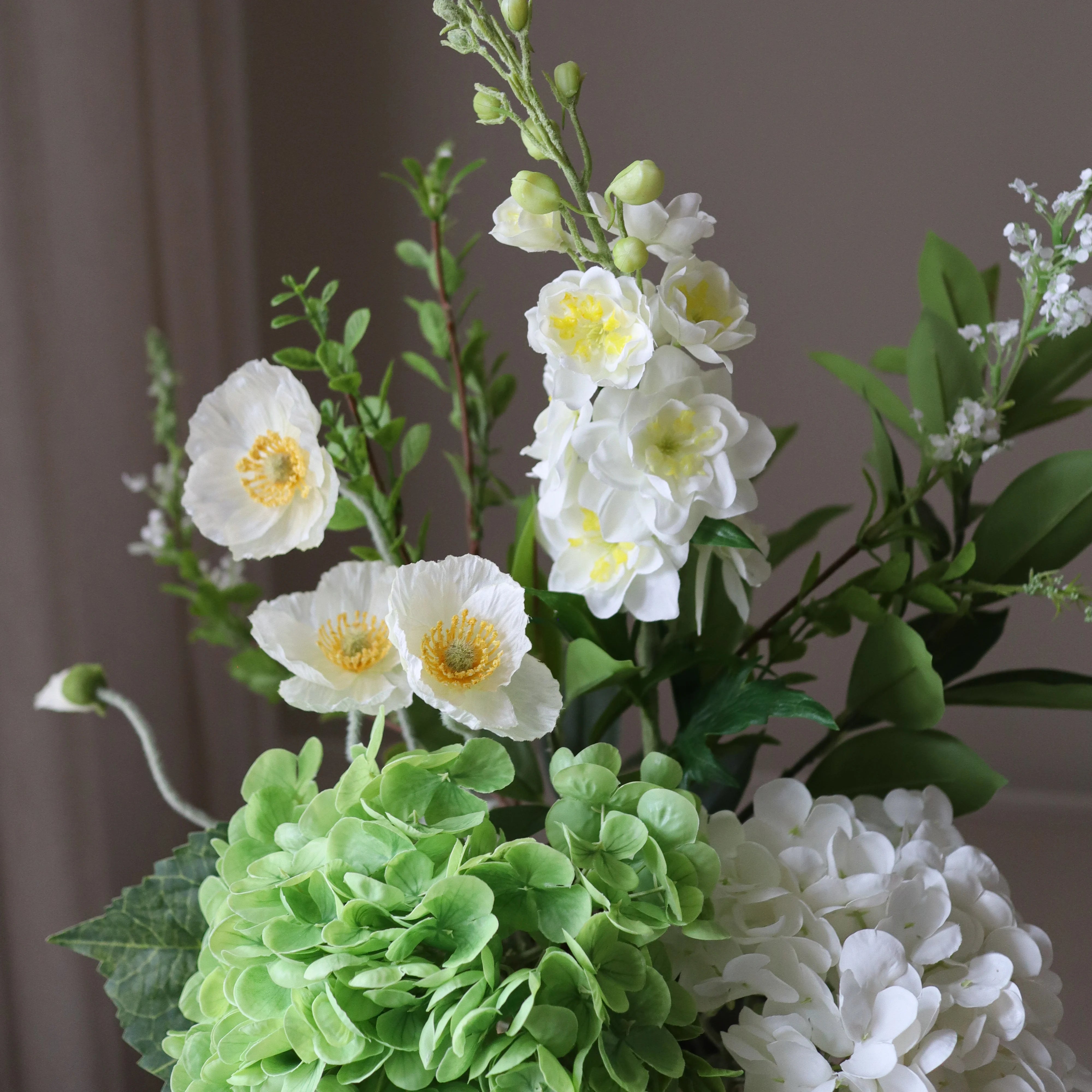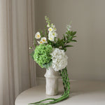 This bouquet showcases a refined palette of fresh green and soft white tones, brought together through rounded floral forms and light, upward-reaching stems. A gentle contrast between compact blooms and trailing elements adds depth while maintaining a calm, balanced composition.