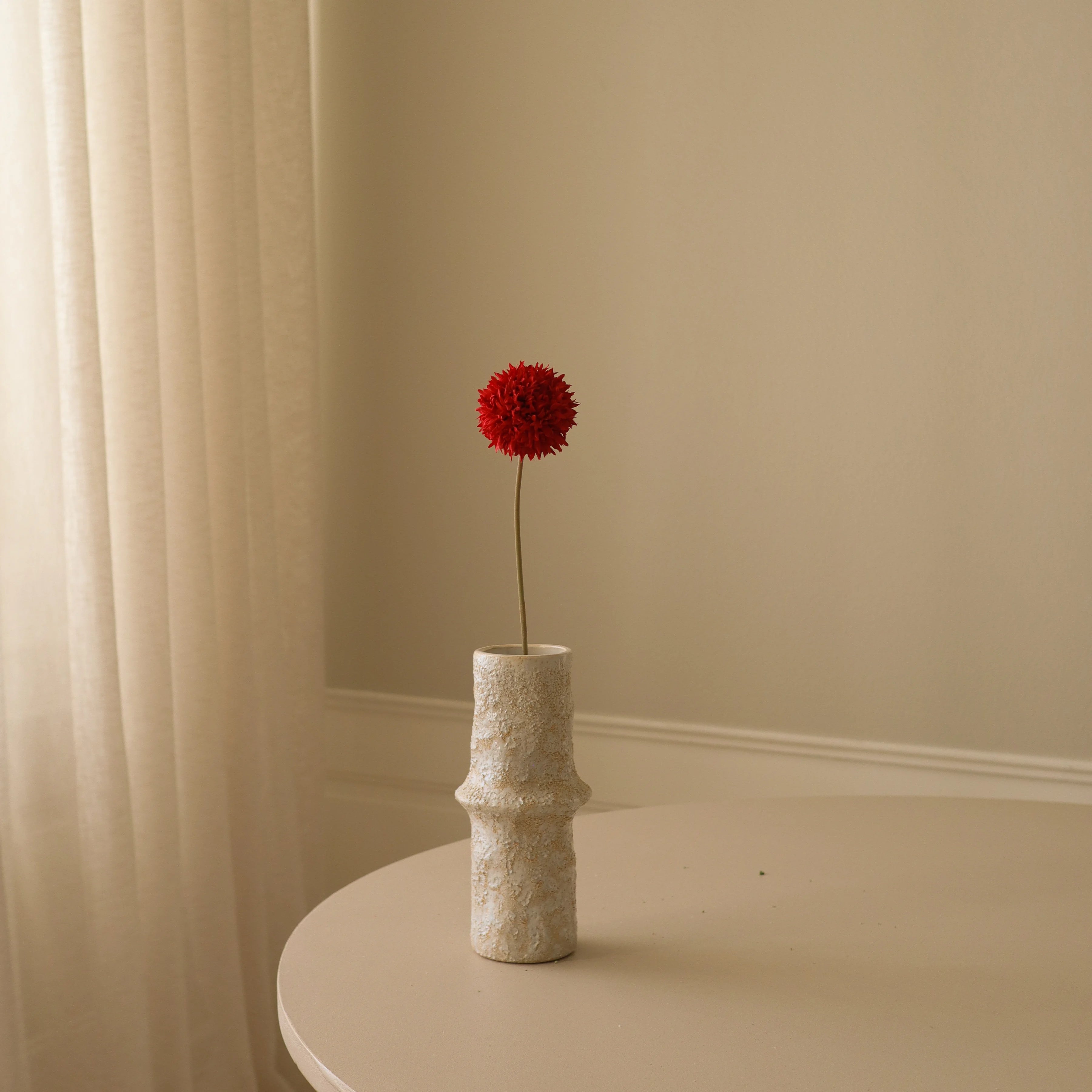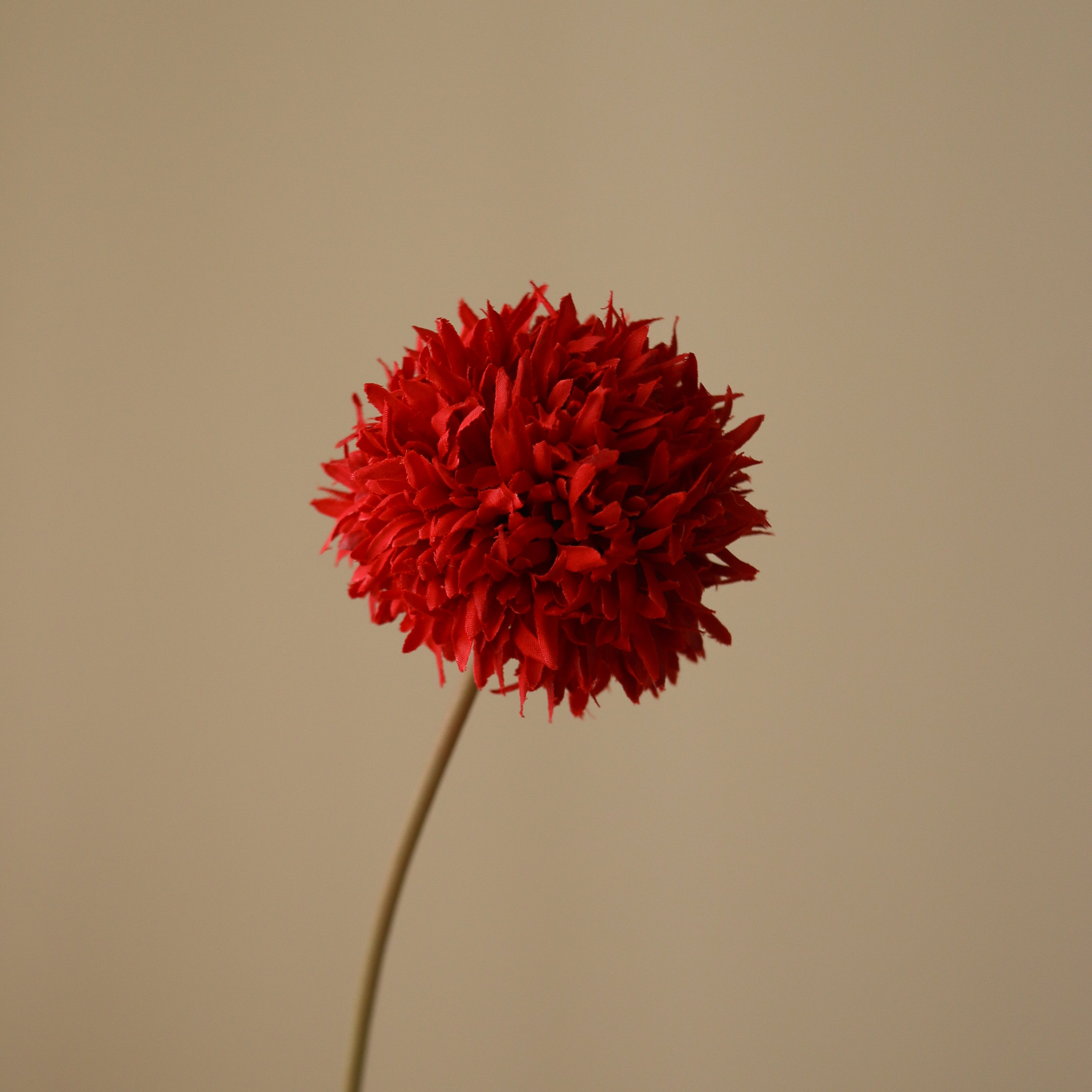 This Red Allium Bulb has a detailed design that closely resembles fresh Allium flowers. The single flower head is a bold, deep red with finely layered petals creating a textured, full appearance. The slender stem has a natural green finish with subtle variations and measures 43 cm in height.