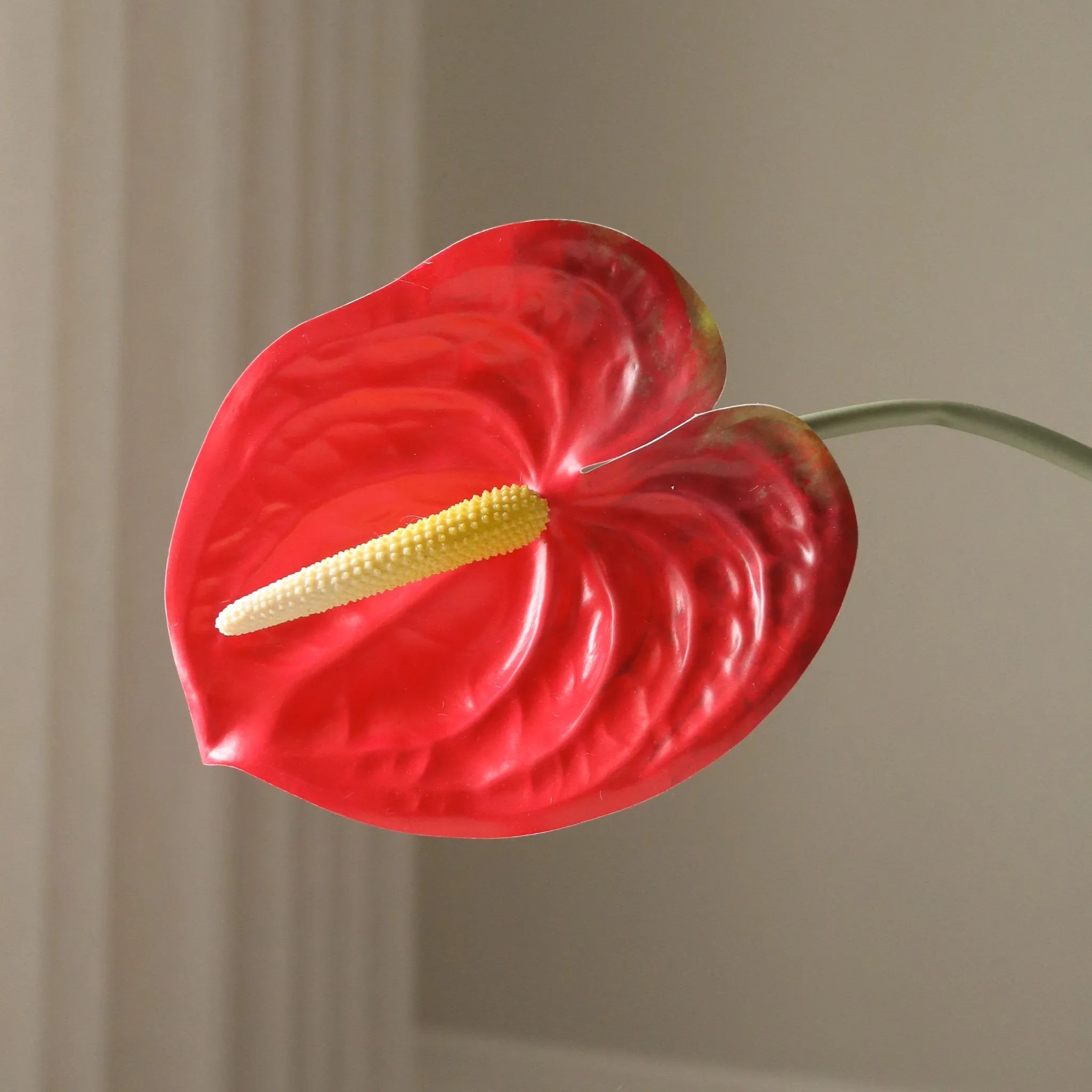 This Red Anthurium Flower features a detailed design that closely resembles fresh anthurium blooms. The single flower head has a bold red color with subtle green shading near the base and a smooth, structured texture. The pale yellow spadix adds a natural touch, while the dark green stem, with its gentle curve and matte finish, measures 67 cm in height.
