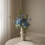 This bouquet brings together soft blue tones with delicate textures. Lush hydrangea blooms are paired with airy poppy flowers and subtle daisy accents, while eucalyptus leaves add a fresh touch.