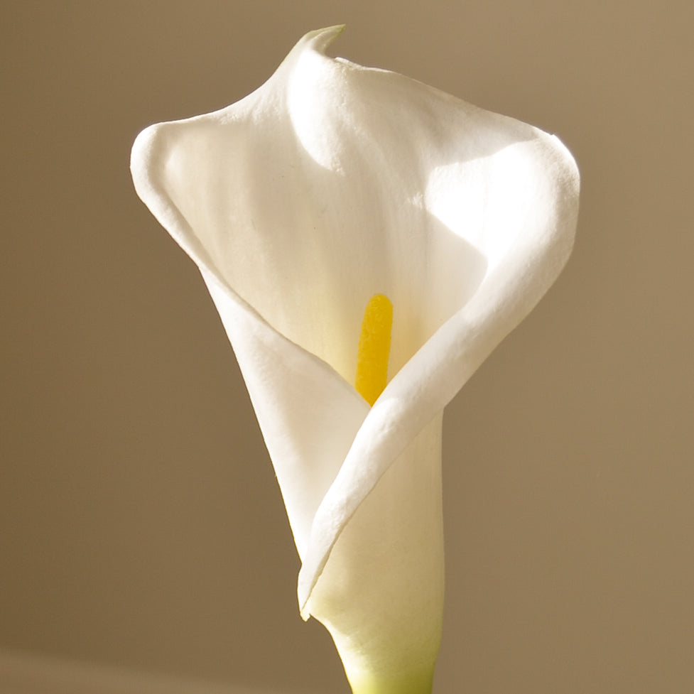 This White Calla Lily Flower has a very detailed design. The single flower head displays a pure white, trumpet-shaped bloom with a smooth, velvety texture, complemented by a soft yellow spadix nestled at its center. The stem measures 45 cm in length..
