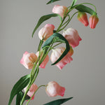 This Pink Chinese Lantern Lily features multiple soft pink, bell-shaped flowers with a gradient of pale cream transitioning into deeper pink at the petal edges. The blossoms are arranged along a slender green stem, which extends upward with natural curvature. The long, narrow green leaves have a smooth texture and slightly pointed tips. The stem measures 95 cm in height.