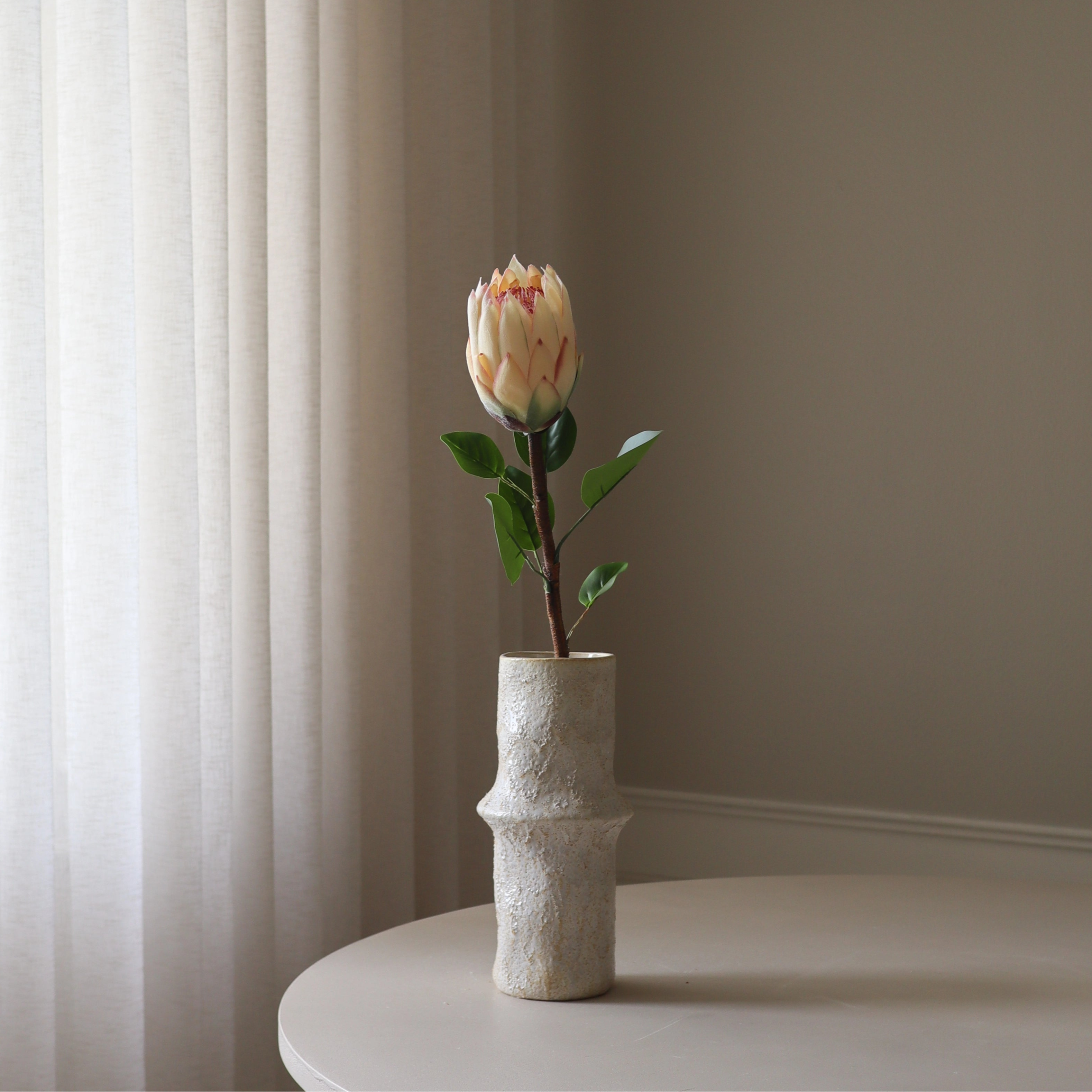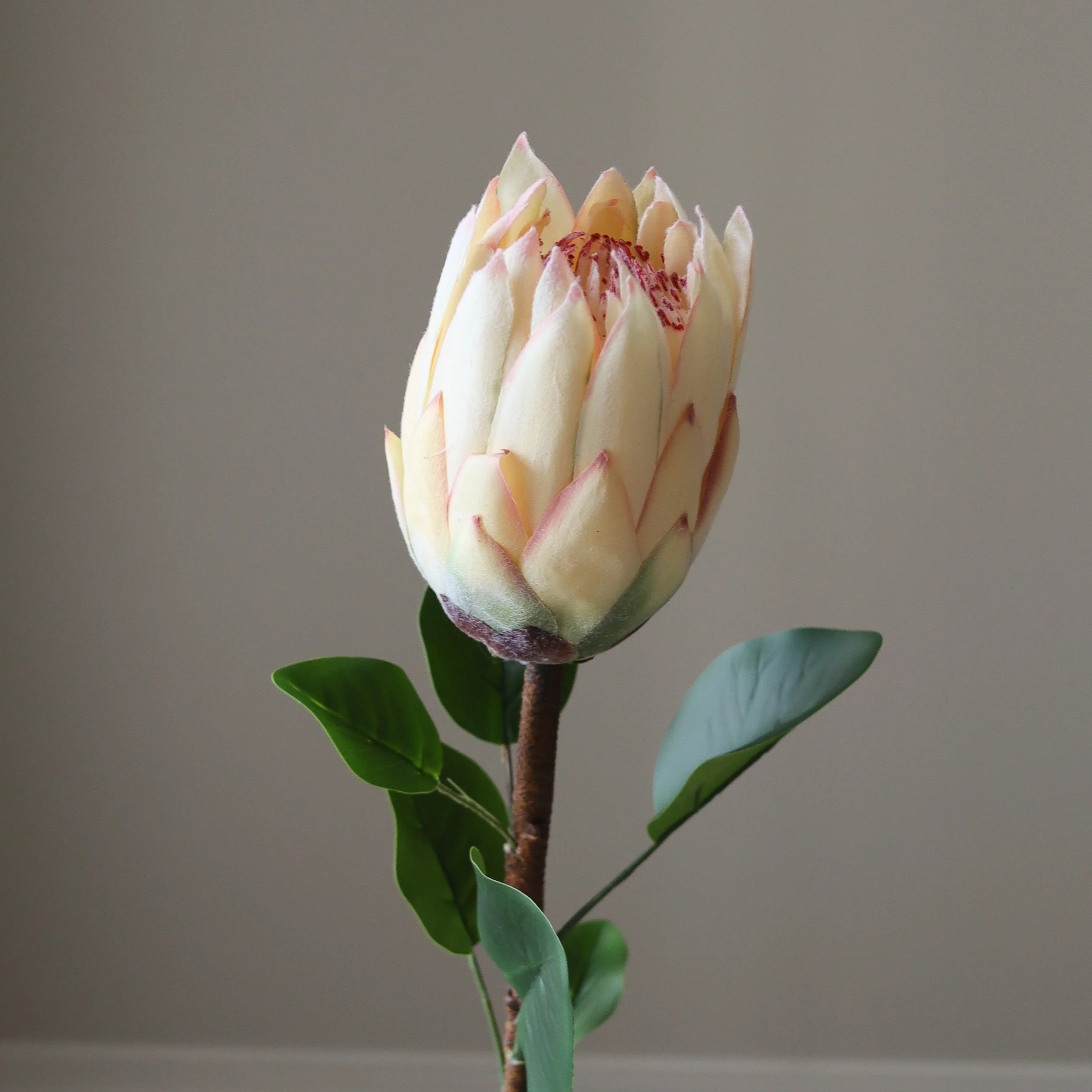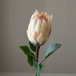 A tall and elegant stem featuring one large protea head in a soft cream tone with touches of peach and blush, framed by broad green leaves. The flower is supported by a natural-looking stem and measures approximately 70 cm in height.