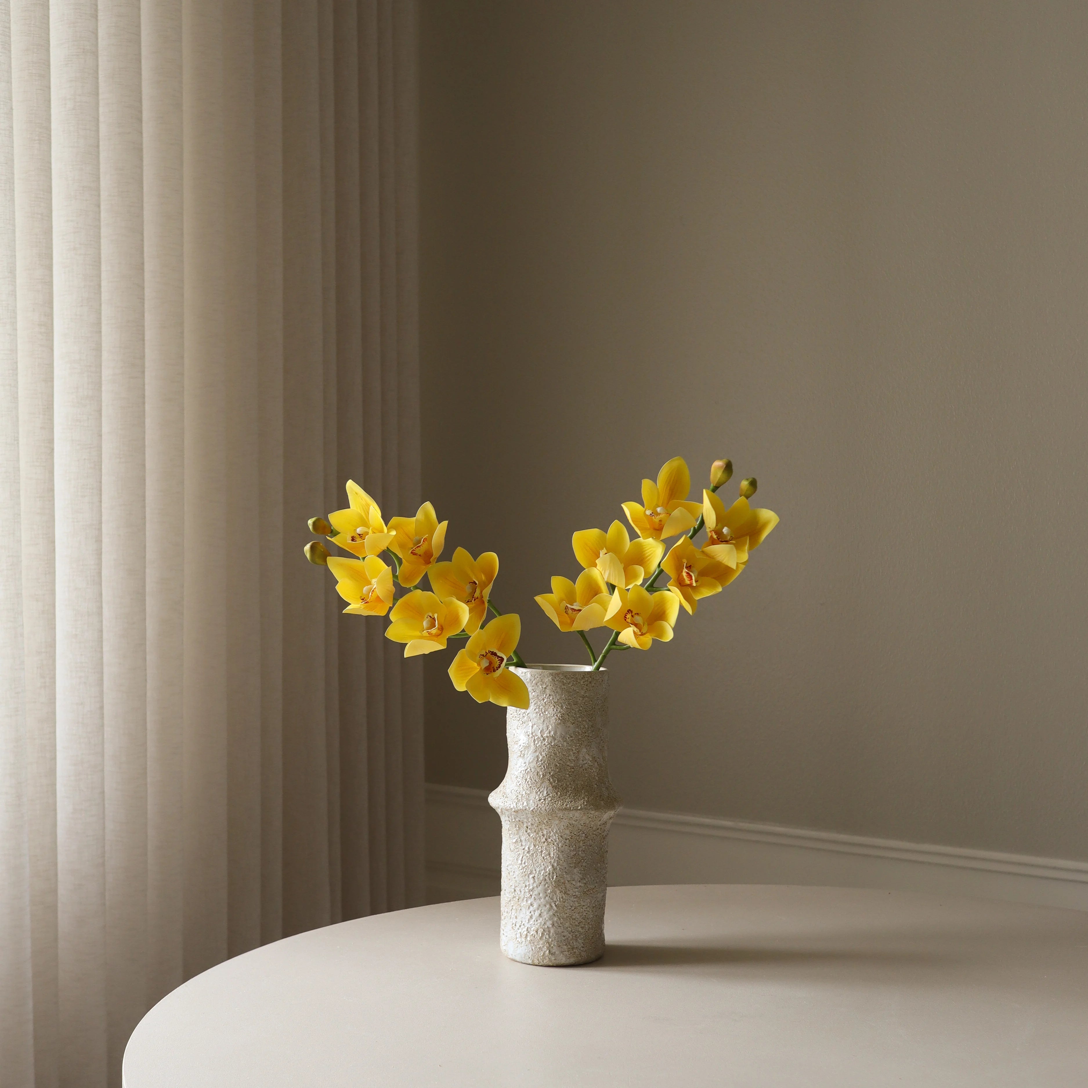 This Yellow Cymbidium Orchid Flower features a series of golden-yellow blossoms with smooth petals and a lightly ruffled lip, accented by warm orange details. The flowers are arranged along a gently curving green stem, which measures 69 cm in height.