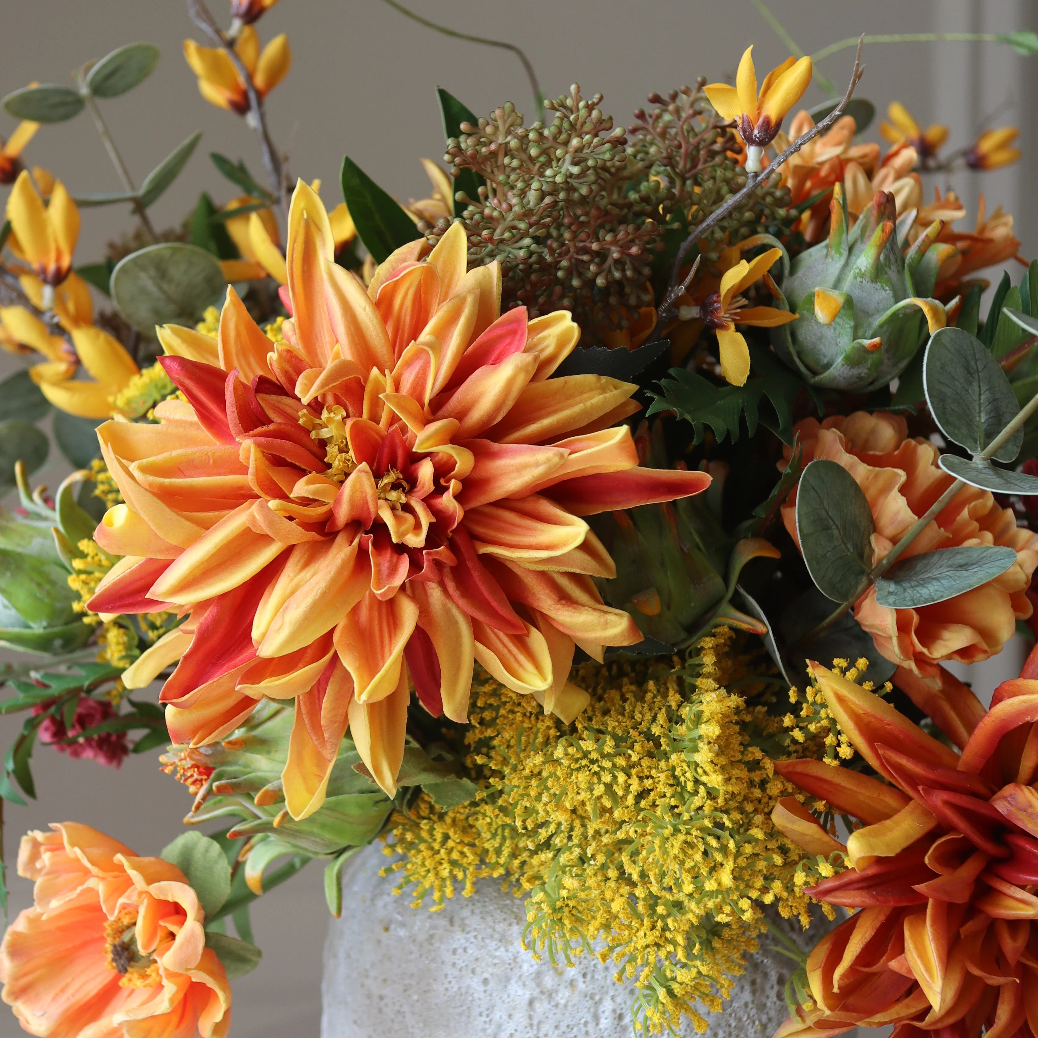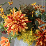 This bouquet showcases a rich composition of warm, autumnal tones with layered textures. The combination of deep, earthy hues and golden accents creates a balanced arrangement, while trailing elements add movement and depth. Lush greenery enhances the natural feel, providing contrast to the bold, structured blooms.
