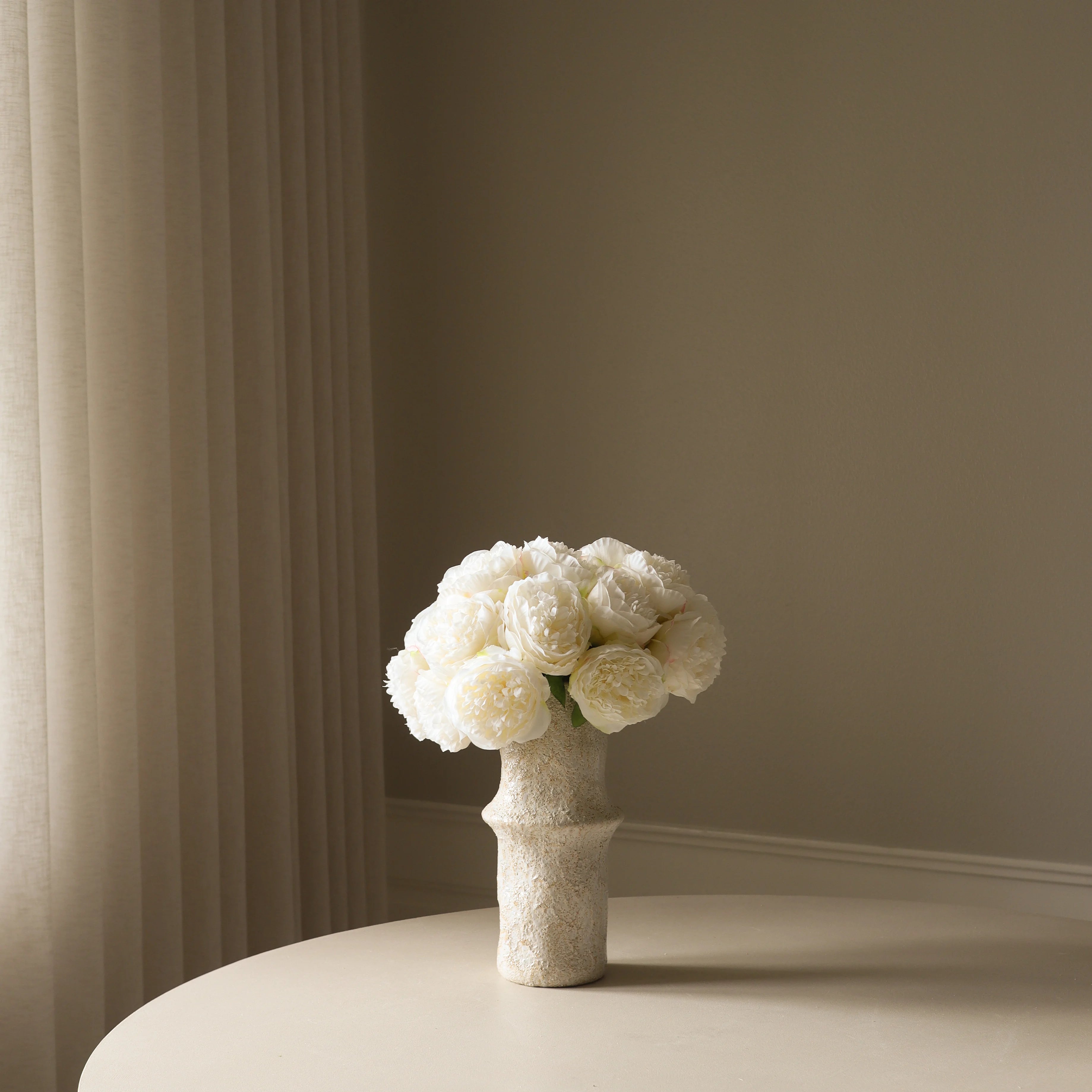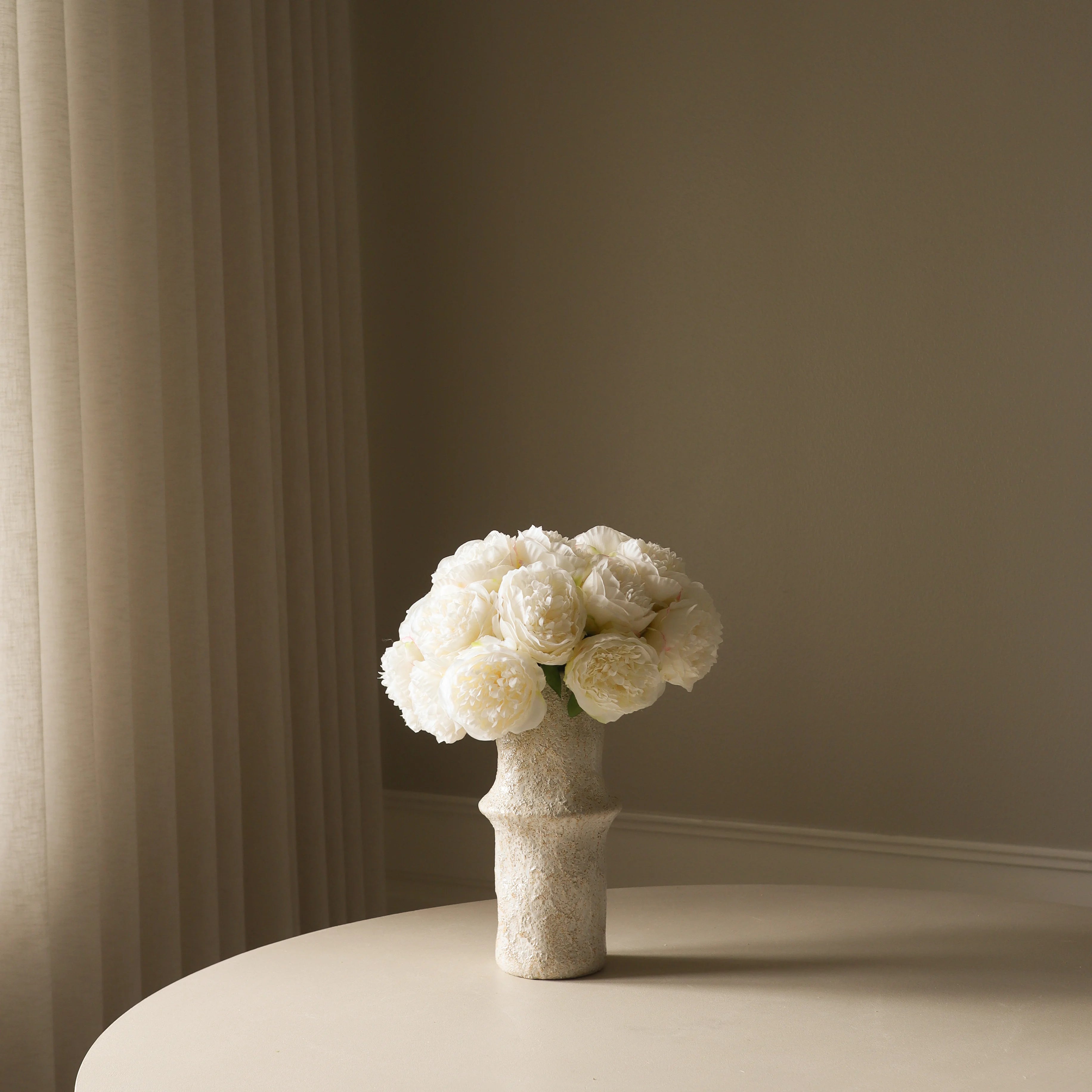 This arrangement features a soft and compact composition, blending delicate white petals with a rounded, full-bodied structure. The blooms are arranged in a tight, harmonious cluster, creating an elegant and refined display. Subtle textural variations and the gentle curve of each stem contribute to a timeless and sophisticated aesthetic, making this bouquet a versatile accent for any setting.