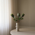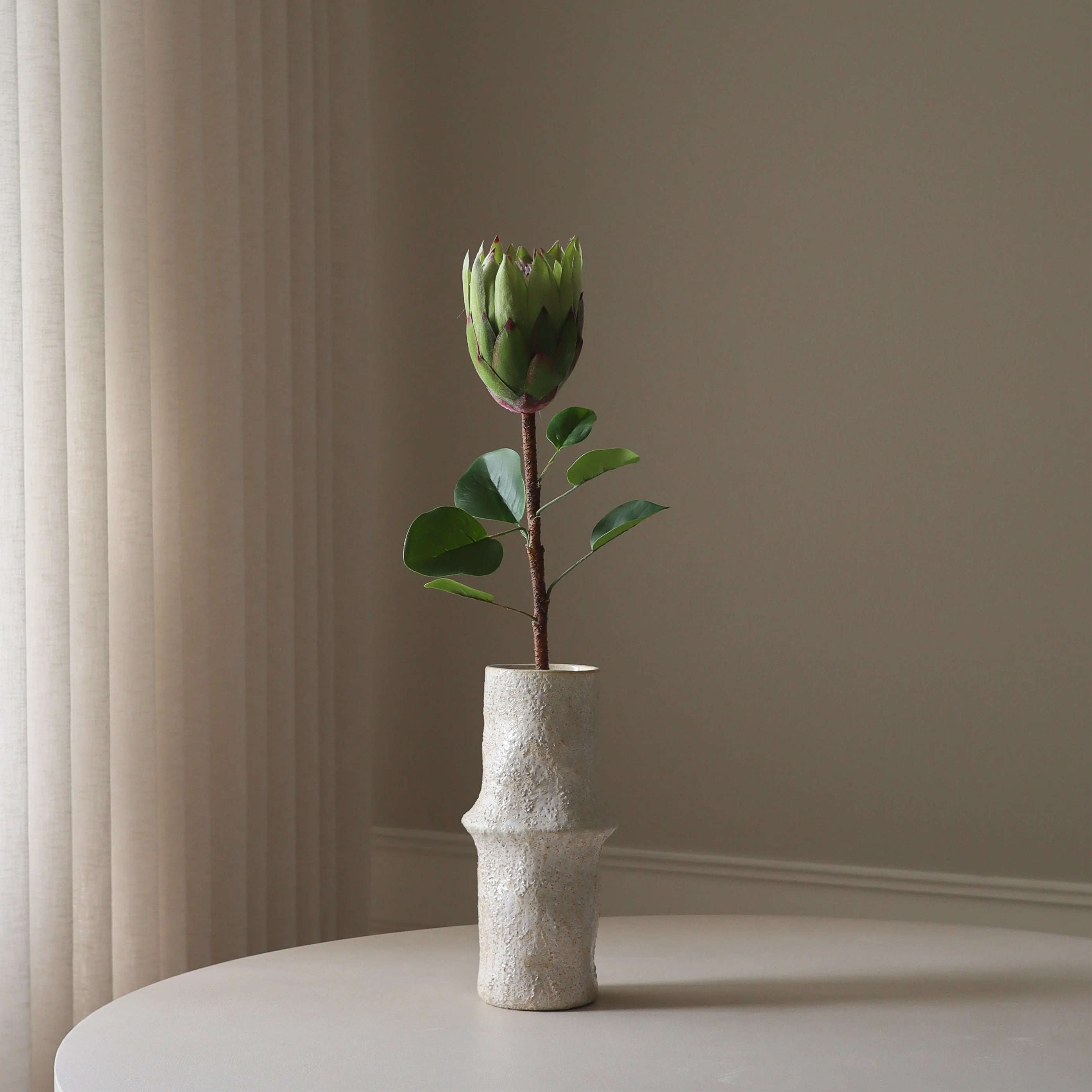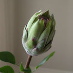 A striking stem showcasing one unopened protea bloom in soft green tones with subtle hints of blush, surrounded by thick green leaves. Perfect as a solo statement or as grounding structure within a larger arrangement. The flower is supported by a natural-looking stem and measures approximately 70 cm in height.