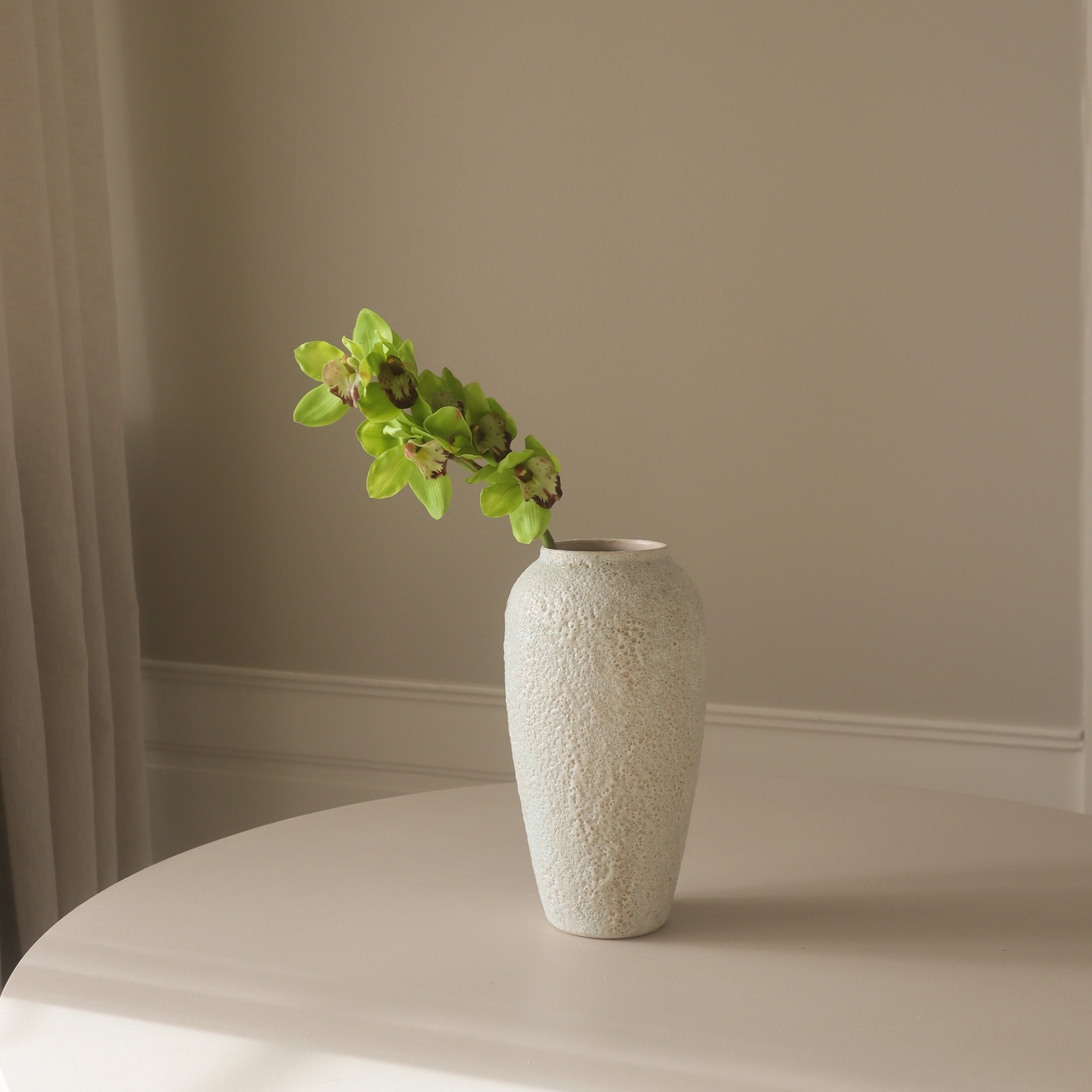 The Large Ceramic Volcanic Vase featured in the image measures 34 cm in height and 10 cm in diameter.