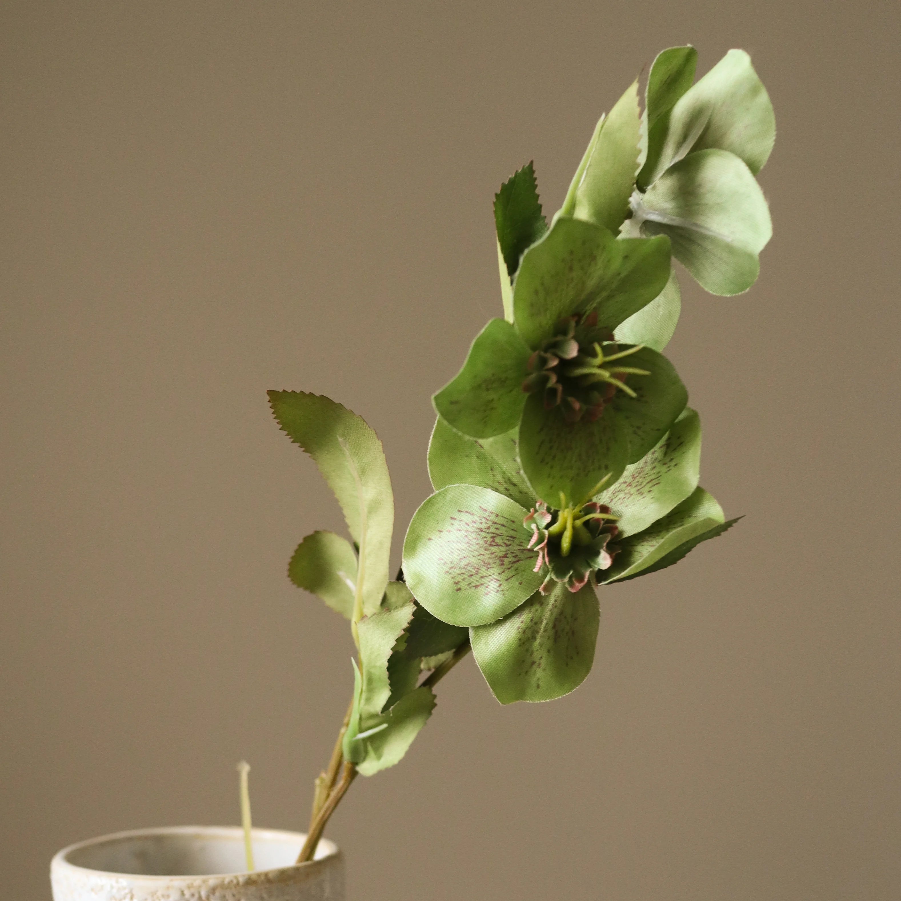 This Green Hellebores Flower features three open blooms with soft, rounded petals in a muted green shade accented by subtle purple speckles. The flowers are attached to a slender green stem with textured leaves and stand at a height of 40 cm.