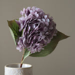 This Purple Hydrangea Flower features a full, rounded bloom with layered petals in soft lavender and muted lilac shades. The dense cluster of petals forms a structured and voluminous shape, complemented by two large green leaves with serrated edges and visible veins. The flower is supported by a slender, slightly textured brown stem, which measures 50 cm in height.
