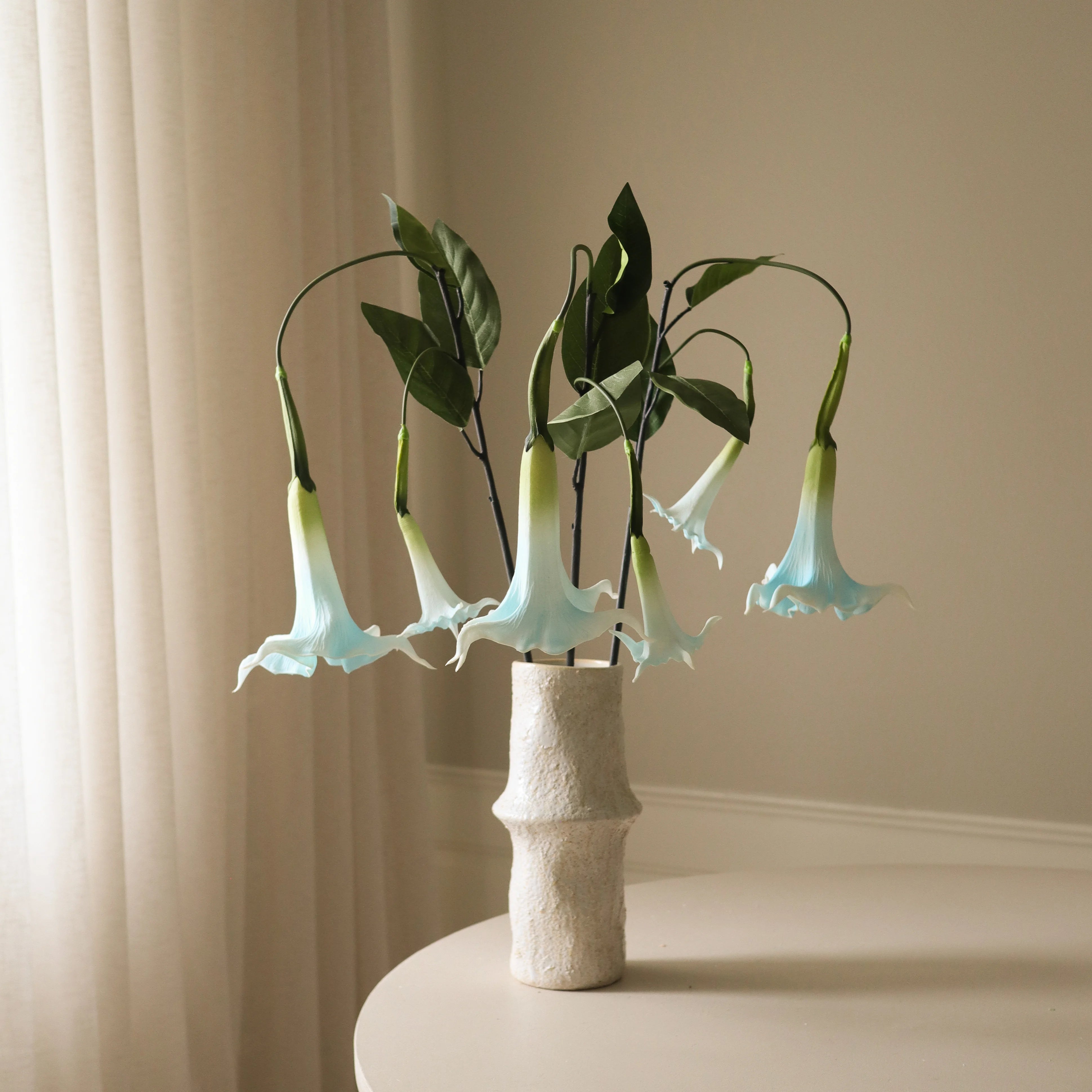 This Light Blue Large Datura Stramonium Flower features two gracefully curved trumpet-shaped blooms with a soft gradient transitioning from pale green at the base to delicate sky blue at the edges. The petals have a lightly ruffled texture, and the structure is complemented by a tall, slender stem with a deep green hue and scattered veined leaves. The stem measures 84 cm in height.