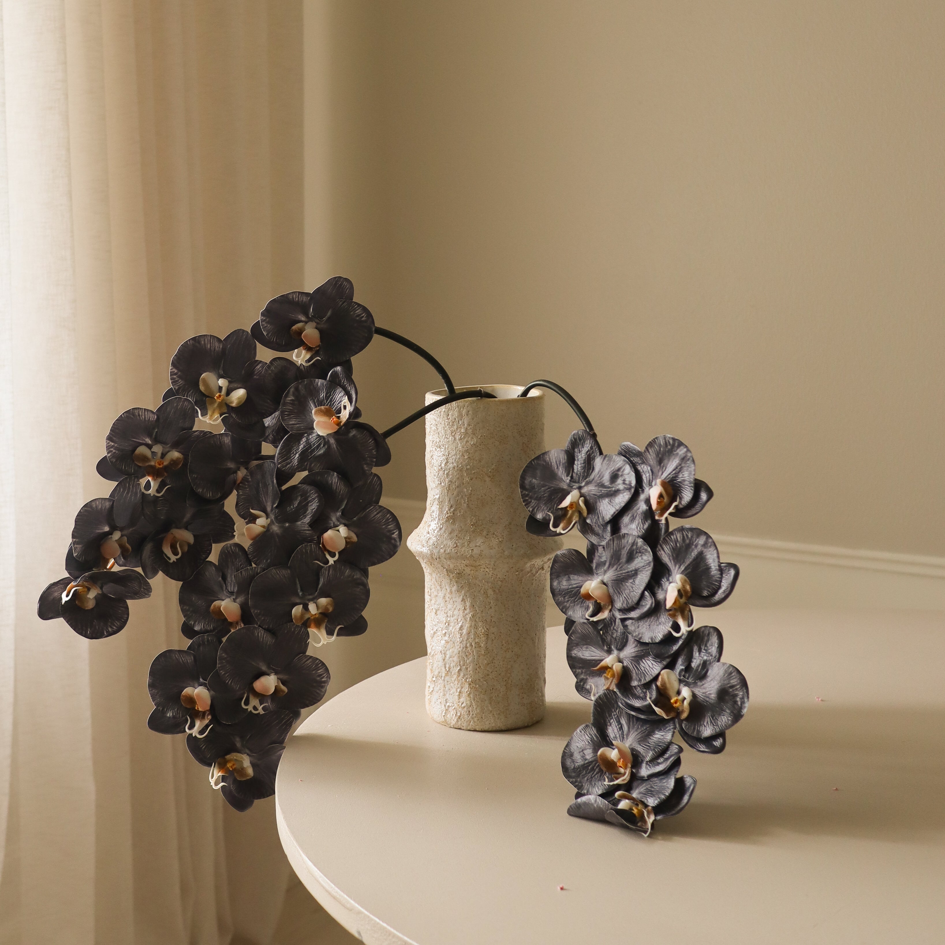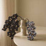 This Black Large Orchid Flower has deep black petals with a soft sheen and subtle texture. The blooms feature cream and brown accents, arranged along a gracefully arching, flexible stem. The green stem is smooth and slightly curved, measuring 90 cm in height.
