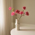 This Pink Lily Magnolia Branch features three large, layered blossoms in a rich pink shade with soft variations of lighter hues along the petal edges. The petals have a slightly curved structure and a natural texture. The branch is dark brown with subtle knots and buds, complemented by small green leaves and fuzzy buds at the base of the flowers. The branch reaches a height of 76 cm.