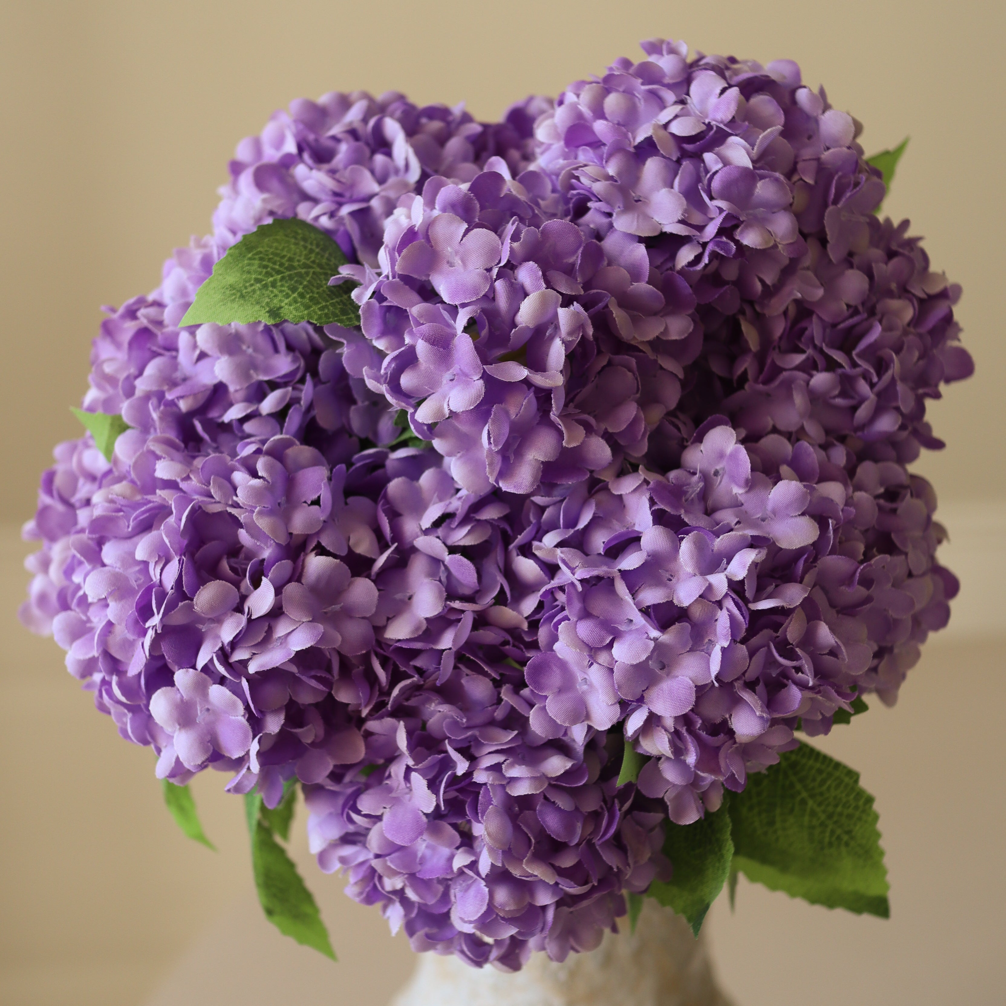 This bouquet showcases voluminous clusters of delicate hydrangea blossoms in a soft purple hue, creating a lush and compact arrangement. The rounded blooms are complemented by textured green leaves, adding depth to the composition.