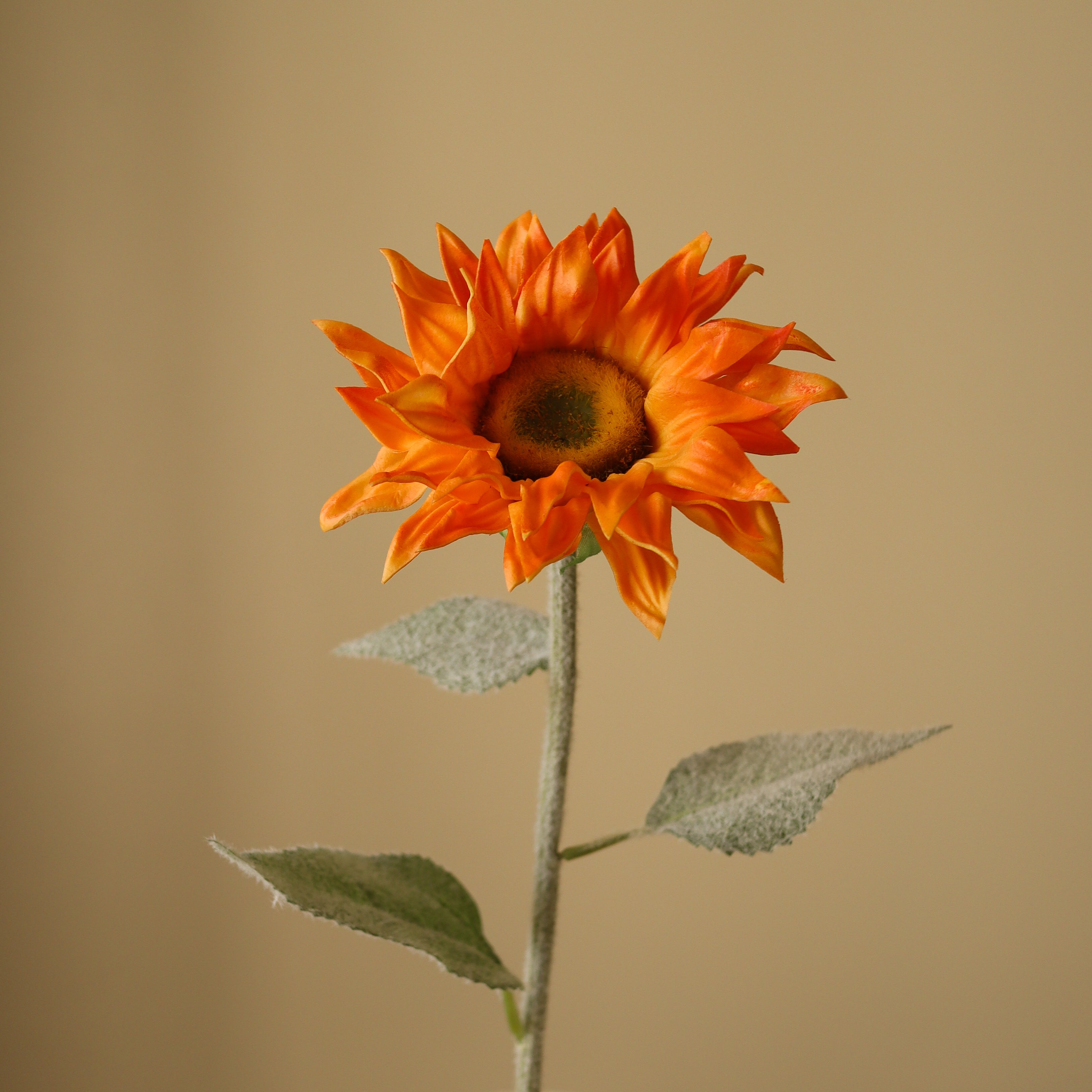 This Orange Pacino Sunflower features layered, slightly curled petals in a saturated orange hue with subtle yellow undertones. The textured center is deep green with a slightly raised surface. The flower is supported by a sturdy green stem covered in a fine, soft texture. Two broad, slightly veined green leaves with a matte finish extend from the stem. The stem measures 40 cm in height.