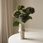 This Pale Purple Hydrangea Flower features a full, rounded cluster of delicate petals in a blend of muted purple, soft green, and subtle hints of deep mauve. The blossoms display a velvety texture with a natural color variation that mimics the fading beauty of late-season hydrangeas. The structured bloom is supported by a sturdy green stem measuring 66 cm in height, accompanied by large, veined leaves in deep green.