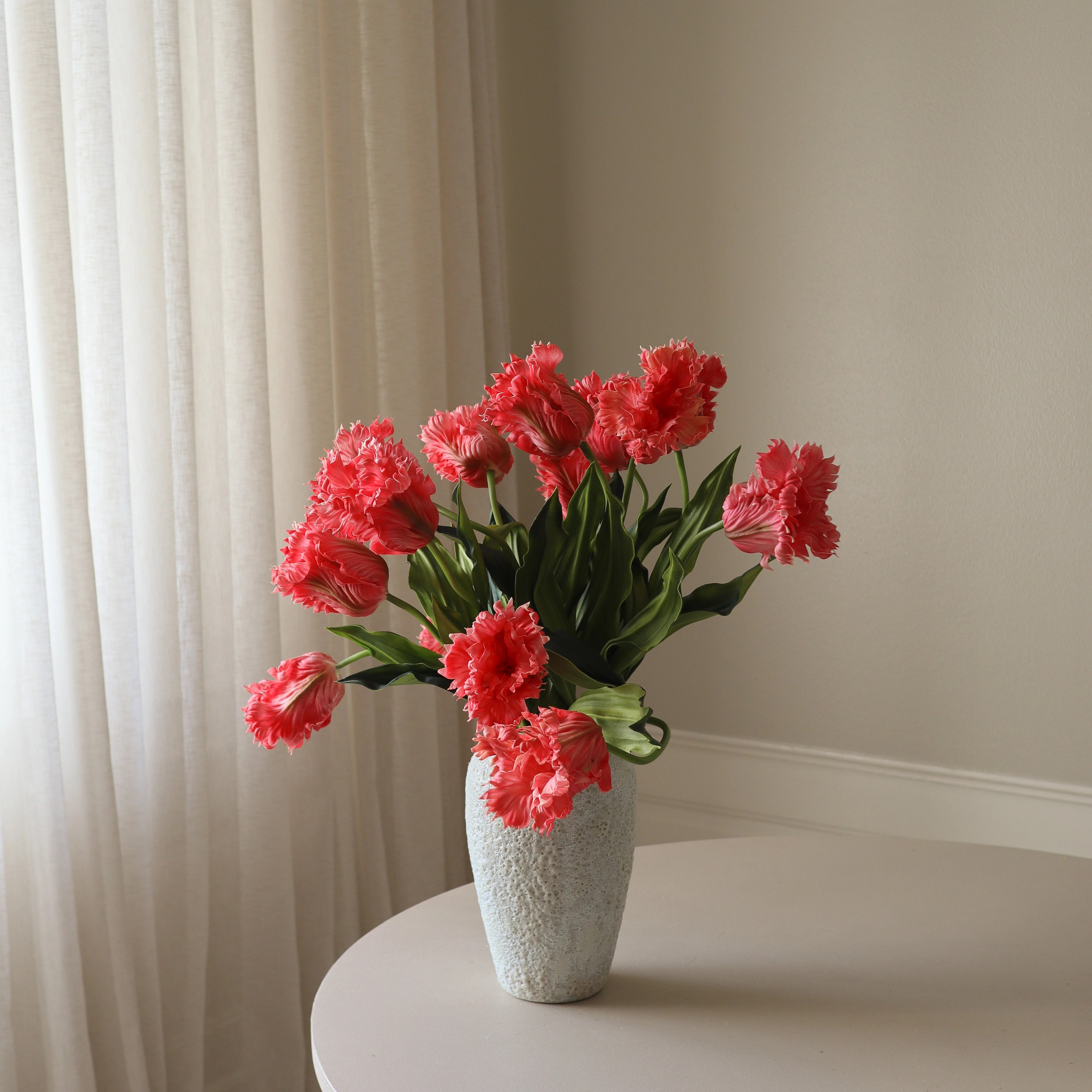 This bouquet showcases the striking beauty of red parrot tulips, with their ruffled petals and dynamic, arching shapes. The bold red tones contrast with the deep green leaves, creating a dramatic and elegant composition.