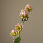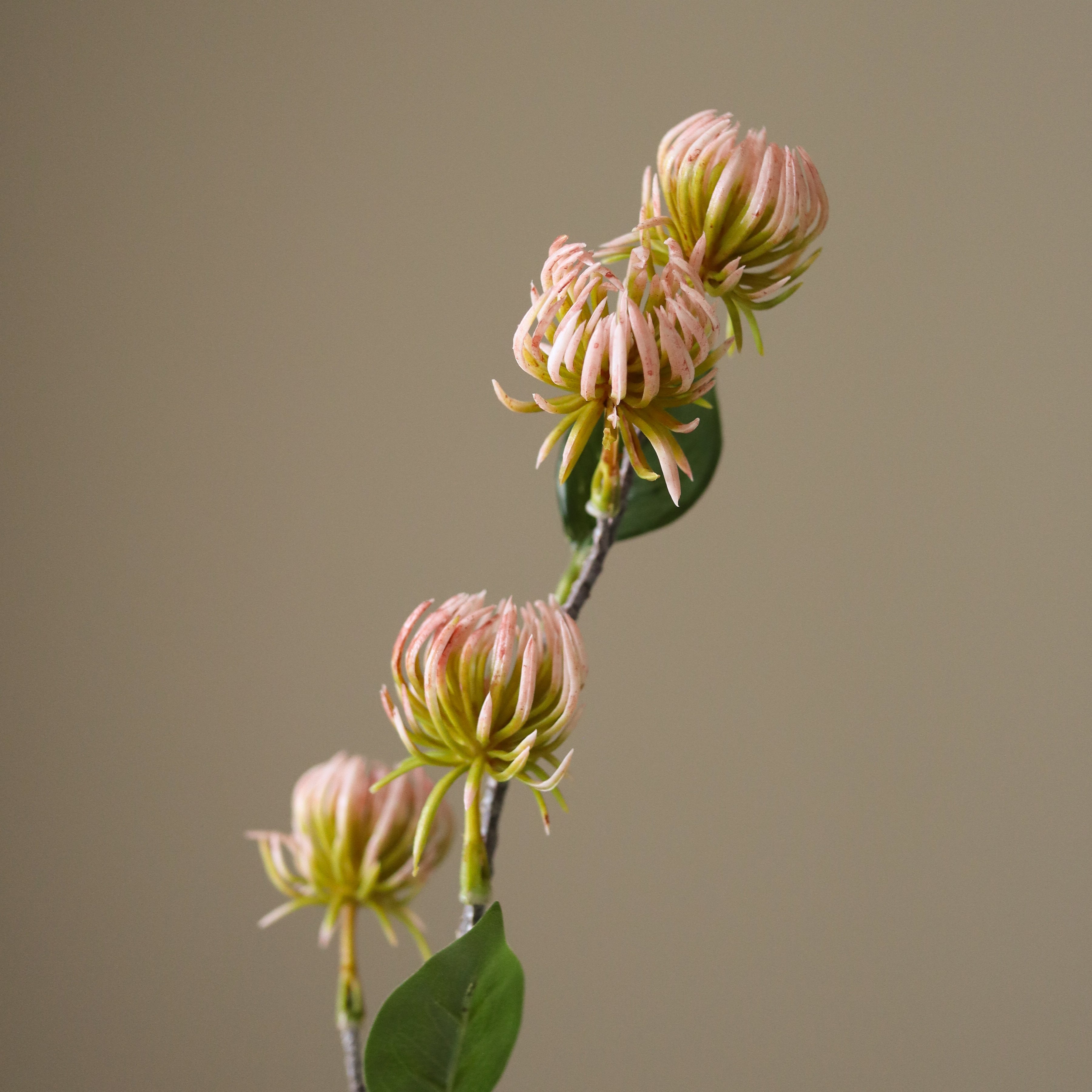 This Pink Hamamelis Branch features multiple small blossoms in a soft pink hue with subtle green accents, giving it a delicate and structured appearance. The petals have a curved, slightly spiky structure, arranged in a rounded formation. A few scattered green leaves contrast with the blossoms, adding to the natural composition. The slender, slightly textured green stem extends to a height of 86 cm, supporting multiple offshoots adorned with clustered blooms.