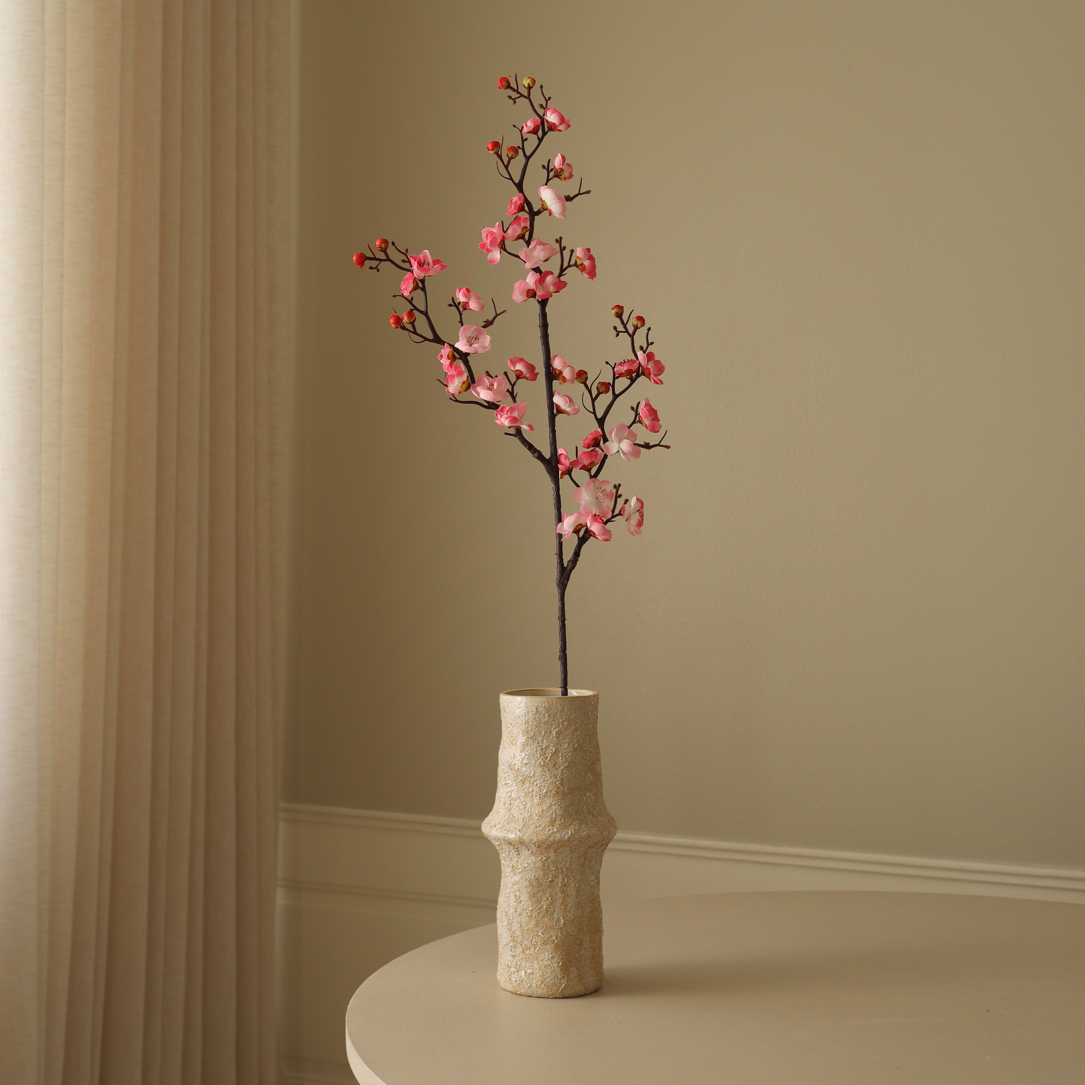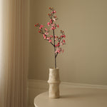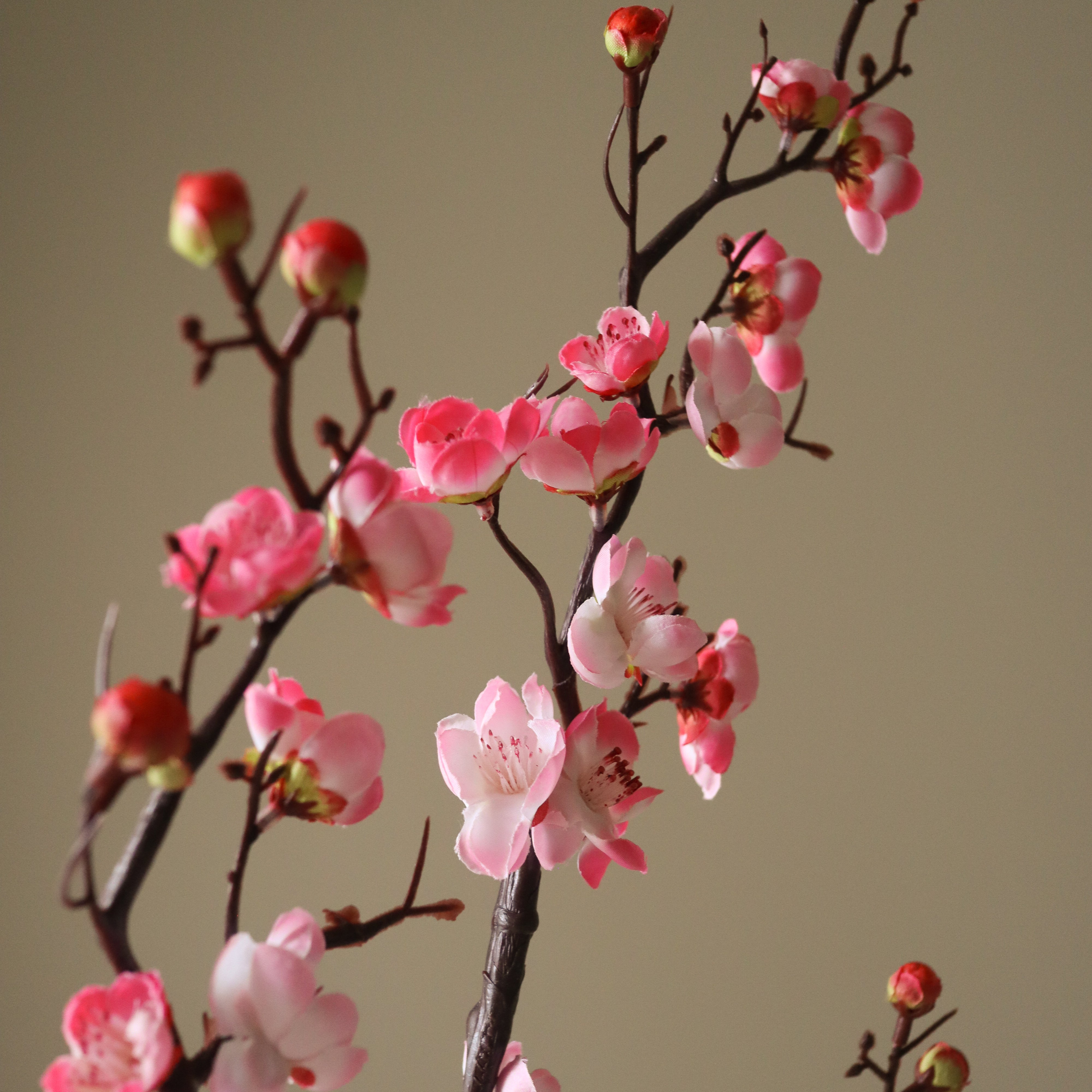 This Pink Plum Blossom Branch showcases delicate blossoms in soft pink hues, accented by deeper coral-toned buds along a dark brown, textured stem. The intricate petals and fine stamens add depth to the composition, while the branching structure creates a natural, organic shape. The branch reaches a height of 94 cm.