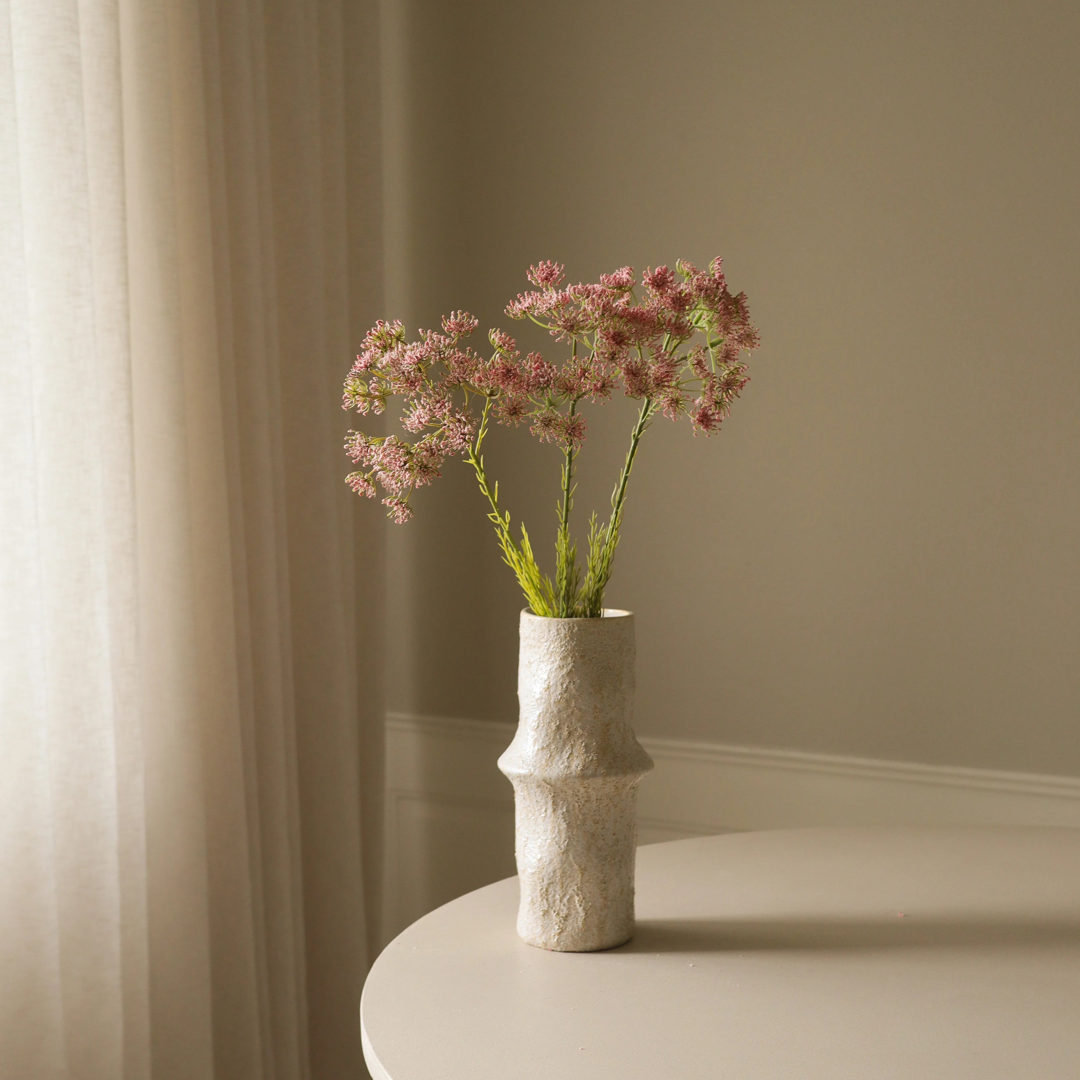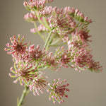 This Pink Queen Anne's Lace Flower features delicate clusters of tiny pink blossoms, each with a fine-textured, lace-like appearance. The blossoms are arranged on slender, branching green stems, which measure 64 cm in height, with small, finely cut leaves scattered along their length.