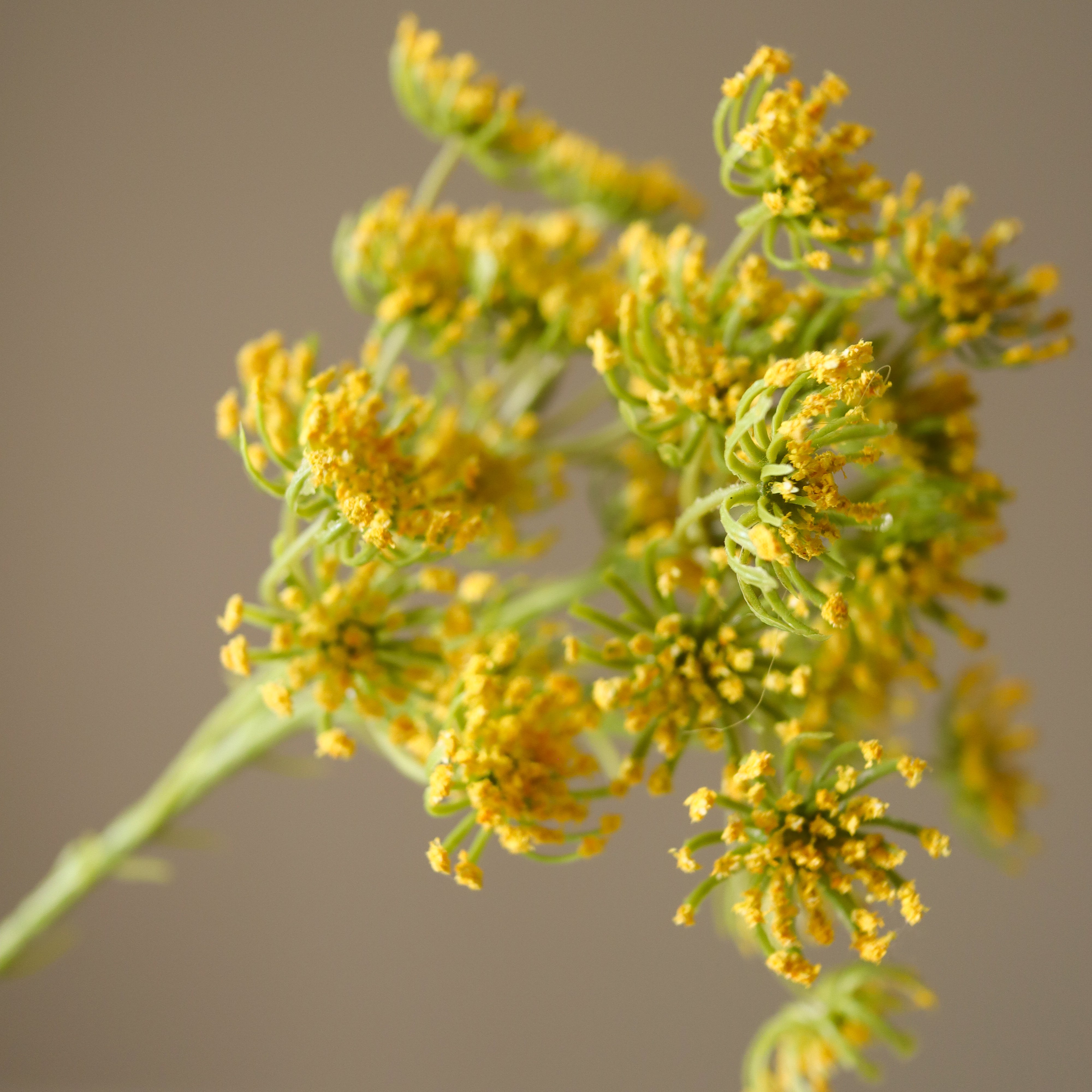 This Yellow Queen Anne's Lace Flower features delicate clusters of small golden blooms that create a light, airy appearance. Each cluster is supported by slender green stems with a natural texture. The intricate floral details and subtle color variations add depth, making it a versatile addition to any setting. The stem measures 64 cm in height.